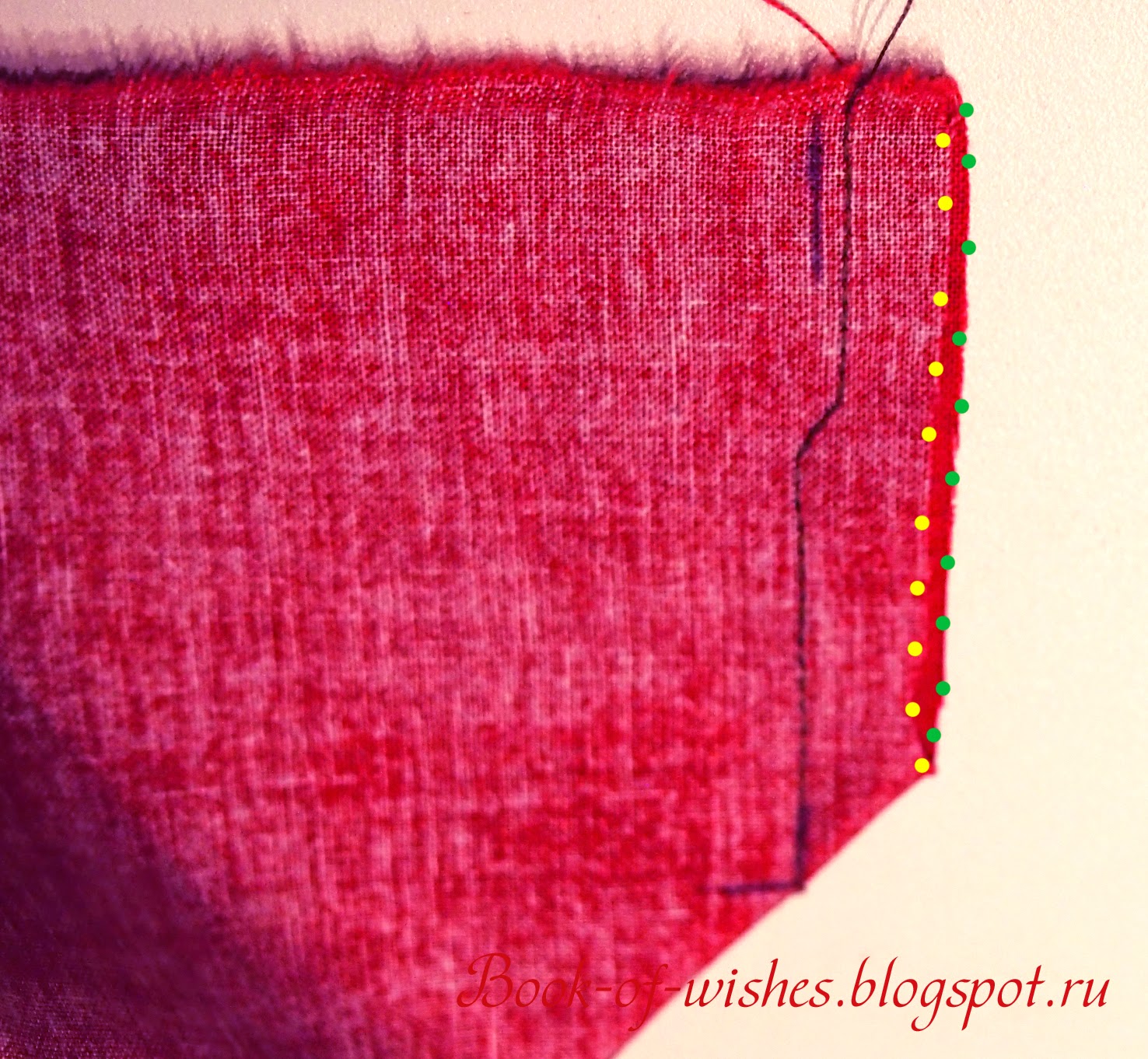 В принципе, можно оставить всё как есть, т.е. внутри окажется треугольник, но мне не понравилось, как он проступает снаружи, поэтому я лишнее срезала, оставив примерно 1 см. Причем я советую первый слой, который в итоге будет прилегать непосредственно к коробке, сделать чуть меньше (желтые точки), а второй слой оставить чуть больше (зеленые точки), чтобы в итоге наш припуск на шов был более плавным и без резкого контура.