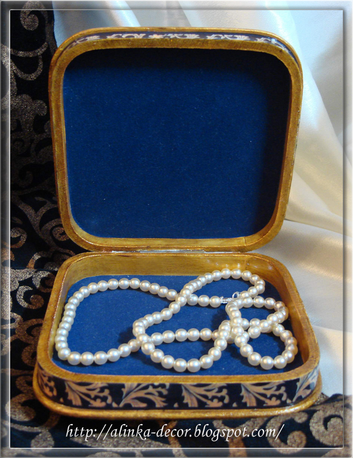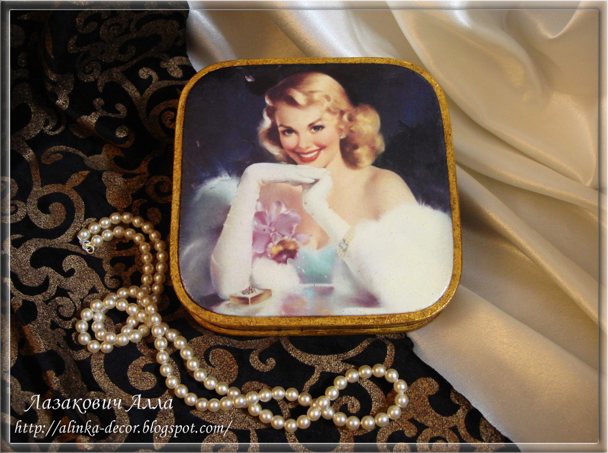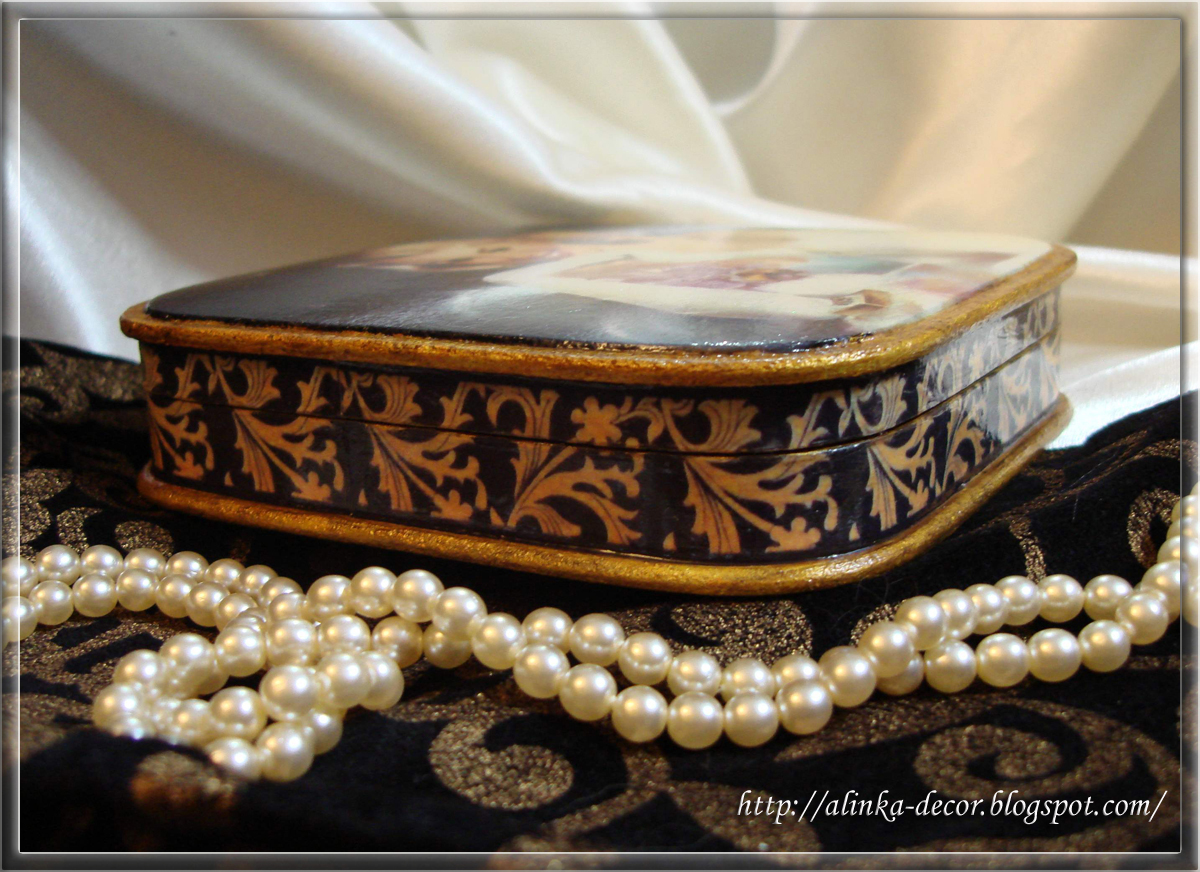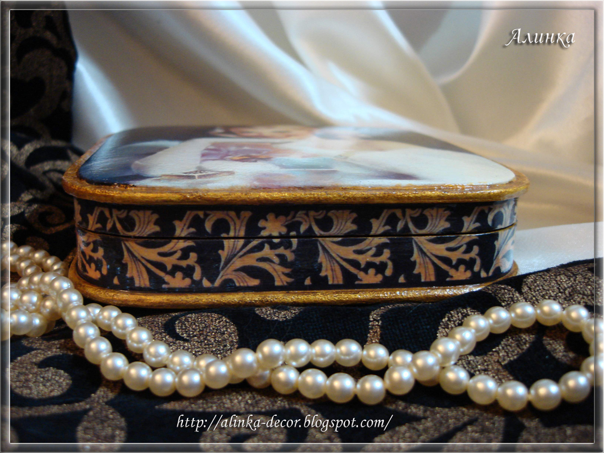 Шкатулка в винтажном стиле. В технике декупаж. На крышке известная распечатка Edward Runci, на боковинах распечатки салфетки. Внутри обтянута синим бархатом. Искусственно состарена битумом и полиролем. Покрыта акриловым лаком.