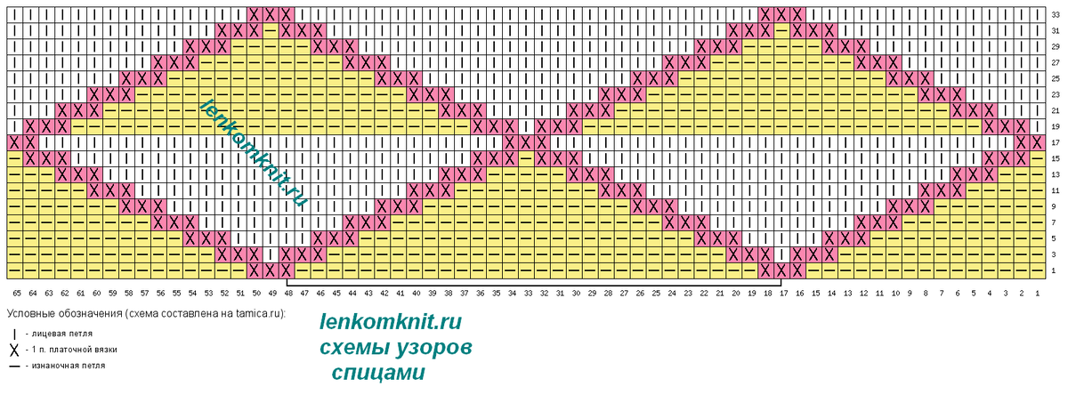 Раппорт у этого узора достаточно крупный – 32 петли в ширину (плюс одна петля для симметрии) и 34 ряда в высоту.