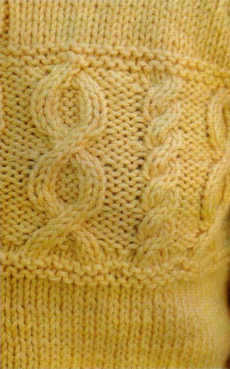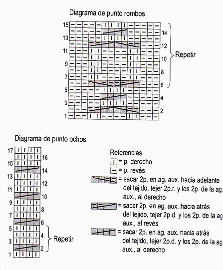 MANGAS: Poner 38p. en ag. № 5 1/2 y hacer 2 cordones en p. Santa Clara. En la última de estas hileras aumentar 8p. repartidos, quedan 46p. En la hilera siguiente del revés, comenzar con el diagrama tejiendo: 3p.d., * 4p.r. ochos, 14p. rombos (3p.d., 2p.r., 4p.d., 2p.r. y 3p.d.) *, repetir de * a * una vez más y terminar con 4p. r. ochos y 3p.d. Del derecho, comenzar los cruces y seguir con los diagramas repitiendo otro rombo de alto como en el cuerpo y a la vez aumentar de cada lado 1p. cada 6 hileras 4 veces, quedan 54p. Hacer nuevamente 2 cordones en p. Santa Clara disminuyendo en la 1° hilera 8p., quedan 46p.