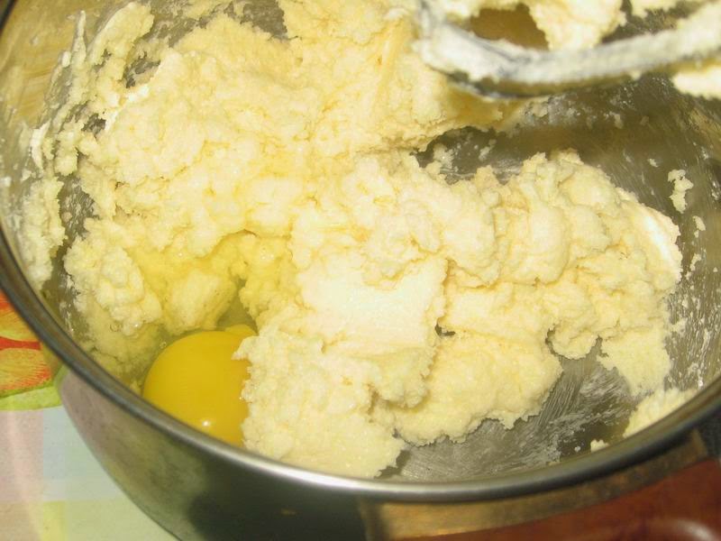 Масло с сахаром перетереть ложкой, потом постепенно вводим яйца по одному, взбиваем миксером.