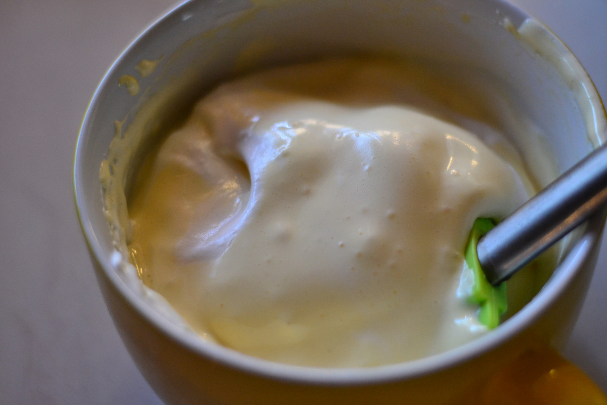 Соединить лопаточкой аккуратно белки с желтками. Сначала взять немного белков и добавить ко взбитым желткам.