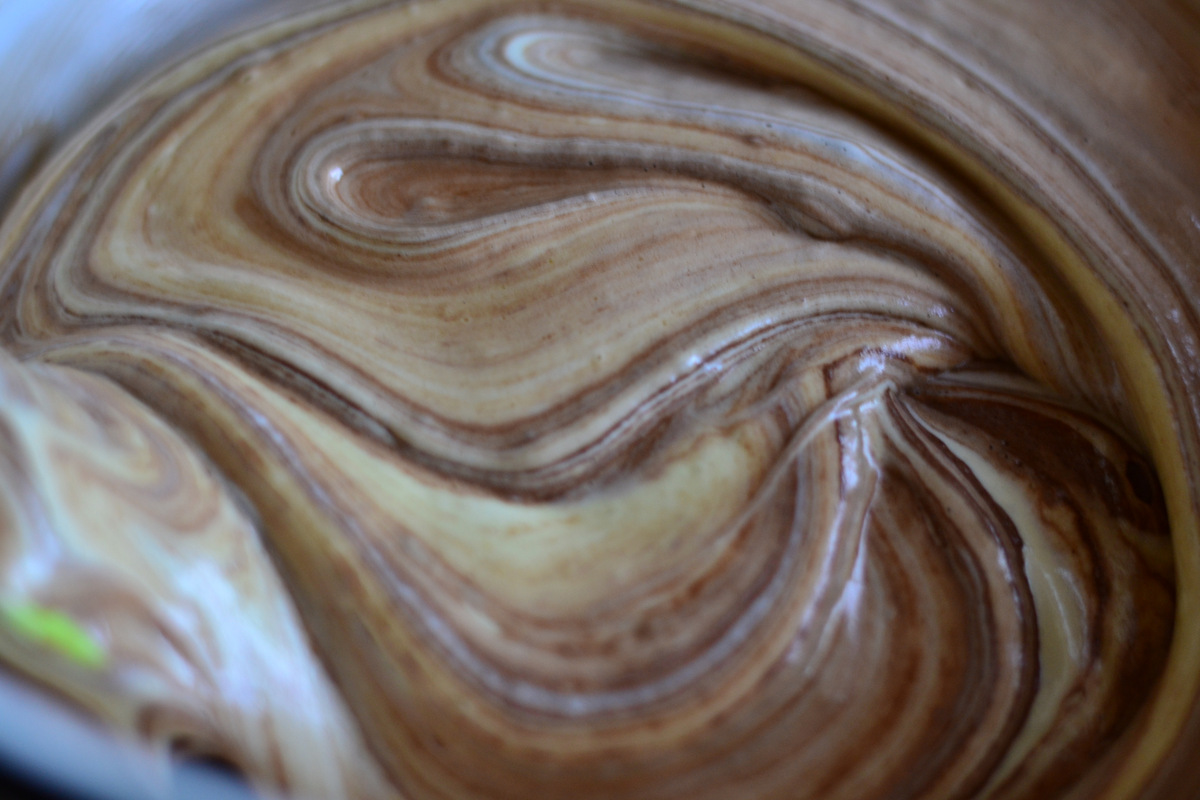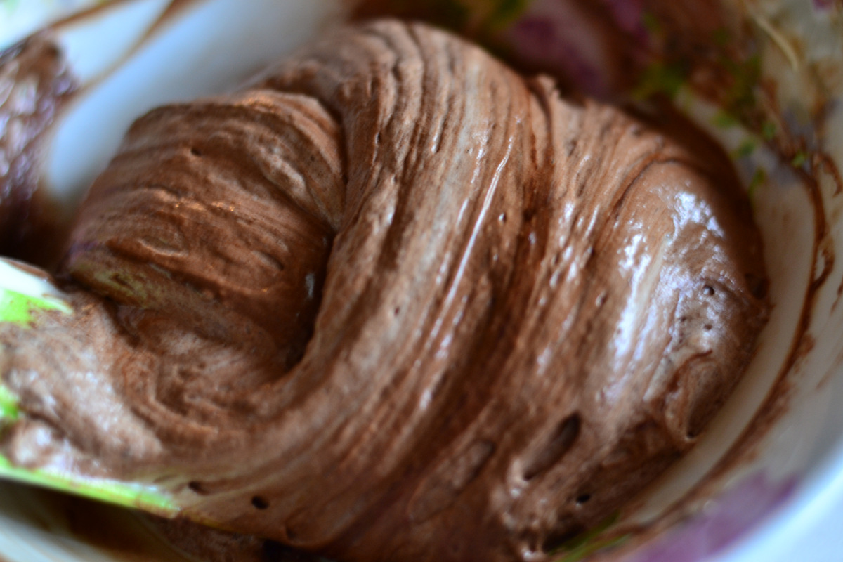 Теперь взять не большую часть взбитых яиц и добавить к растопленному шоколаду, аккуратно перемешать.