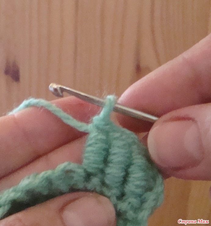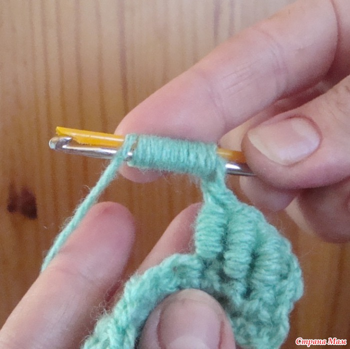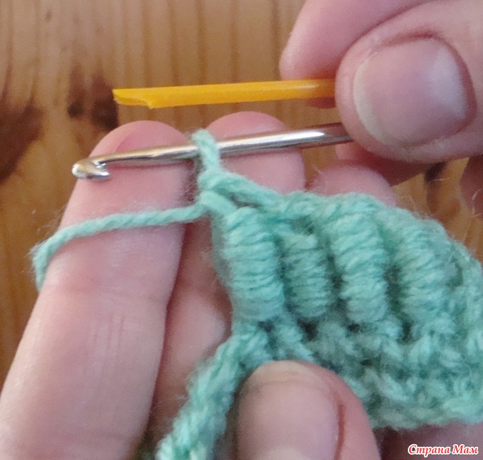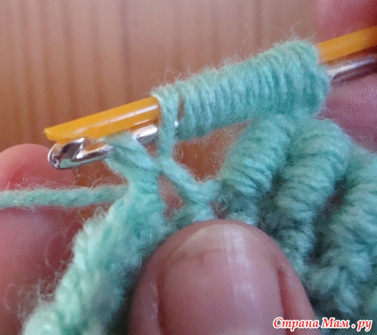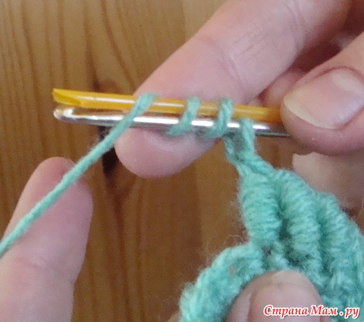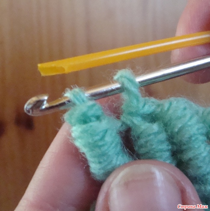 Из предыдущего ряда столбиков вытягиваем петлю, располагая ее на крючке под палочкой. Загогулинку крючка вводим в вырезанную ложбинку на палочке. Так крючок не будет цеплять нити витков при протягивании.