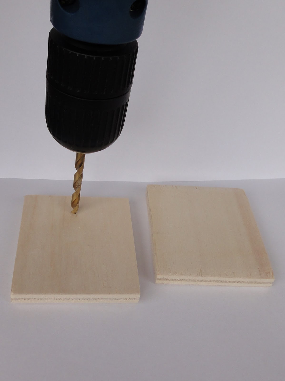 Потом берем дрель, выбираем сверло немного меньше диаметра нашей палочки и сверлим посередине отверстие ближе к краю основы.