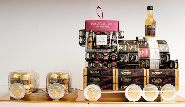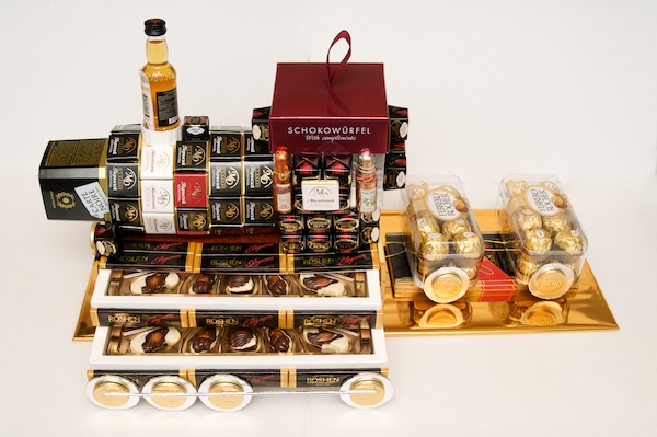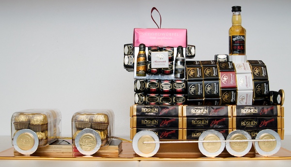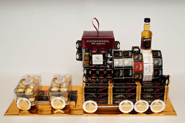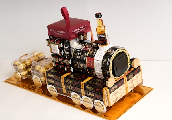 Дальше пошел процесс подборки размера шоколада и обклейки им всех "заготовок" паровоза, крепление бутылочки виски:
