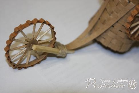3. Вырезаем еще один кружок из крафт картона, только теперь уже точно 4 см в диаметре и приклеиваем сверху. Загибаем лучики наверх и плетем корзинку. 15 сантиметровой полосочки как раз хватало на окружность,Я каждую полосочку прихватывала клеем в начале и в конце круга.