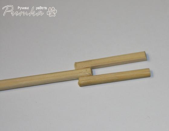 8. Сначала делаем "вилку". От деревянной "китайской палочки" отрезаем два кусочка такой длинны, что бы были чуть выше колеса (мерить от центра - оси) и приклеиваем к оставшейся палочке вот таки образом: