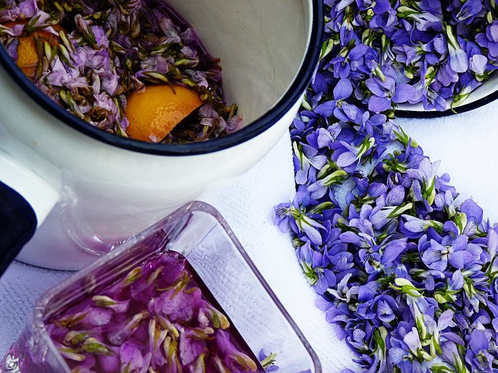 Цветы промыть в холодной воде. Выложить их в кастрюлю, добавить нарезанный на четыре части лимон с кожурой и залить кипящей водой. Дать настоятся в течение 24 часов. По истечении этого времени процедить в другой сосуд. Отжать лимон и цветы . Воду и сахар довести до кипения и варить 20 минут на медленном огне. Когда сироп загустеет добавить сок фиалки и варить около 20-30 минут. на слабом огне, пока смесь не слегка не загустеет. сироп очень сладкий и имеет прекрасный цвет вереска. Вы можете использовать его для украшения, или для подслащивания напитков. Вы также можете приготовить желе.