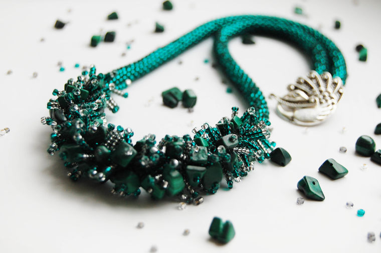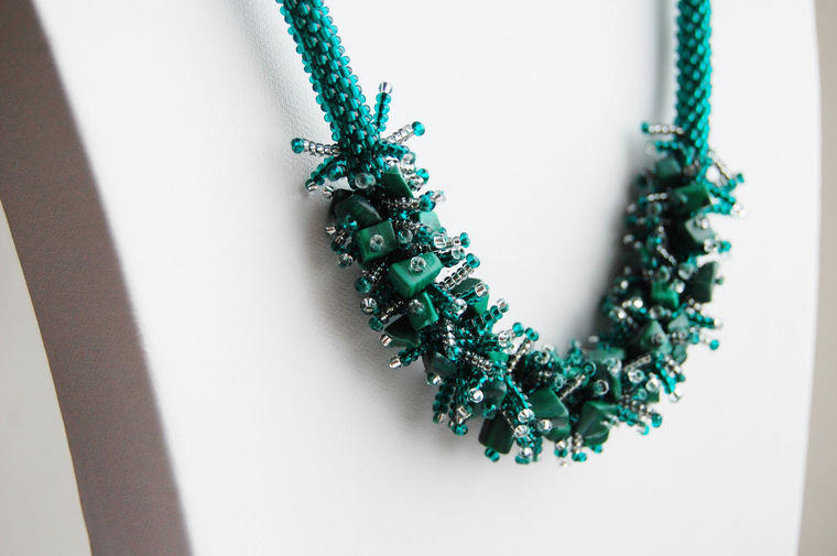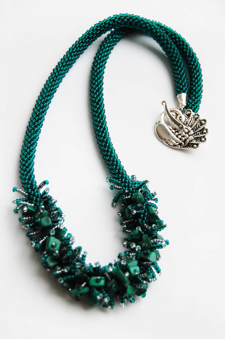 Вязаный Бисерный жгутик из качественного чешского бисера красивого насыщенного темно-зеленого -- малахитового цвета, расшитый каменной крошкой малахита и бисером