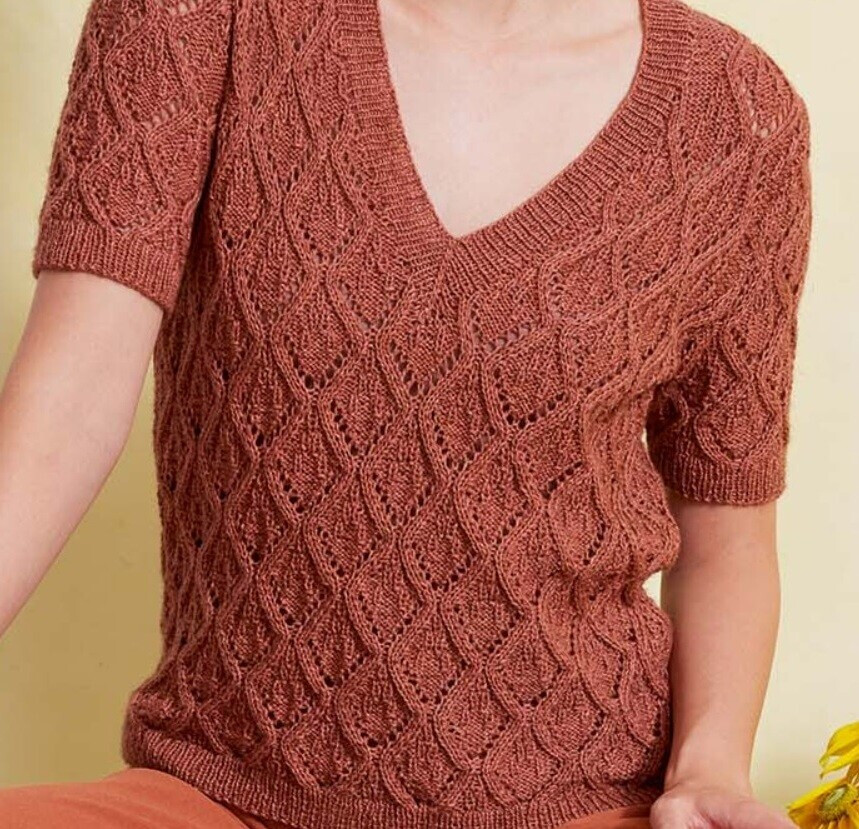 Эта прекрасная модель была опубликована в журнале по вязанию Lang yarns. Топ связан из пряжи в составе которой шерсть и хлопок. Приятный цвет пряжи. Яркий, но ненавязчивый.