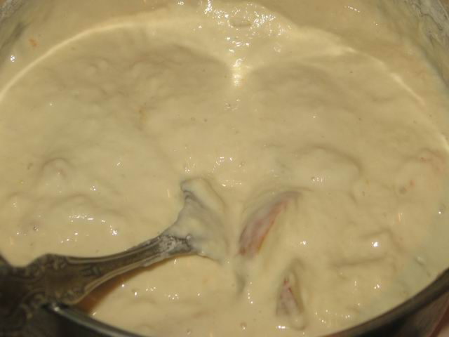 Не дожидаясь, пока дрожжи проснутся, начинаем замешивать тесто. Муку добавляем постепенно. Тесто должно получиться не слишком густым. Гуще, чем густая сметана, но не слишком. С ложки оно должно отрываться, но не литься. Стараемся замешивать без комочков. В этом нам поможет венчик или миксер.