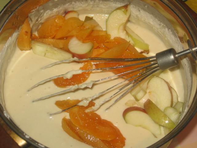 Добавляем в него нарезанные фрукты, аккуратно перемешиваем.