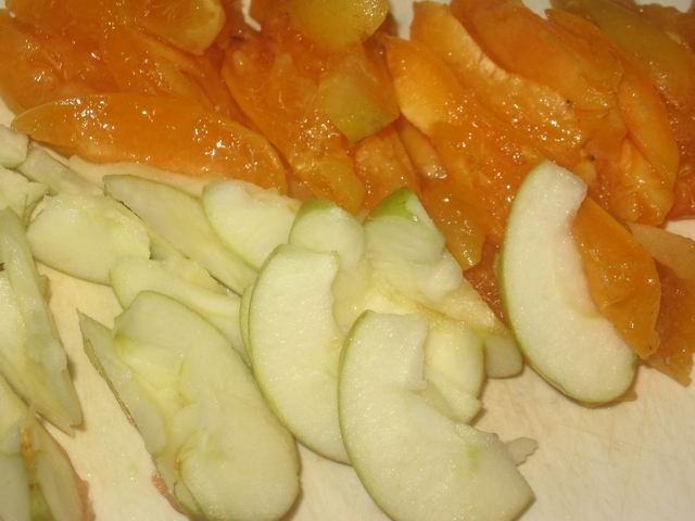 Приготовить фрукты. У меня было 6 крупных абрикосов и 1 яблоко. Нарезаем тонкими кусочками.