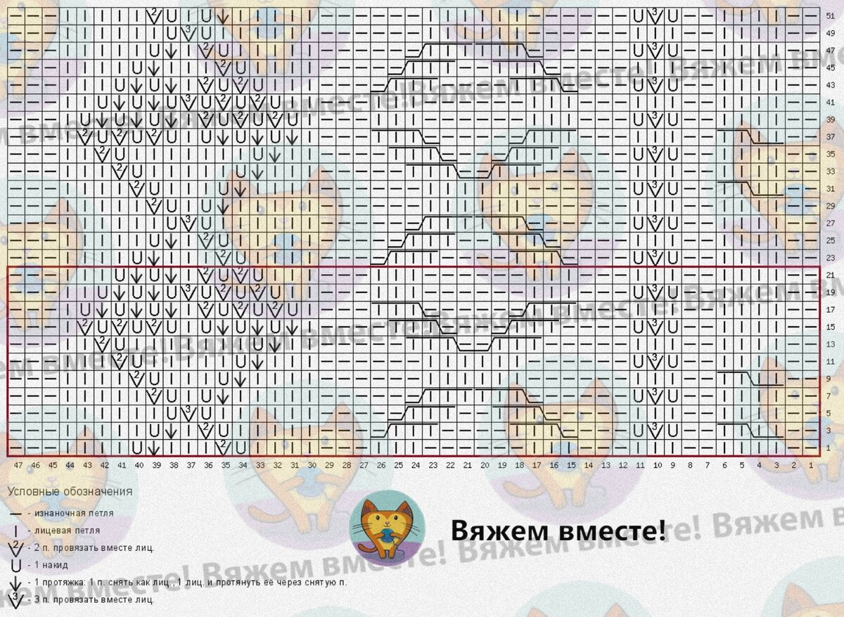 На схеме обозначены только лицевые ряды вязания, чётные вяжутся так, как петли лежат на спице, а петля нового ряда провязывается цветом предыдущей петли.