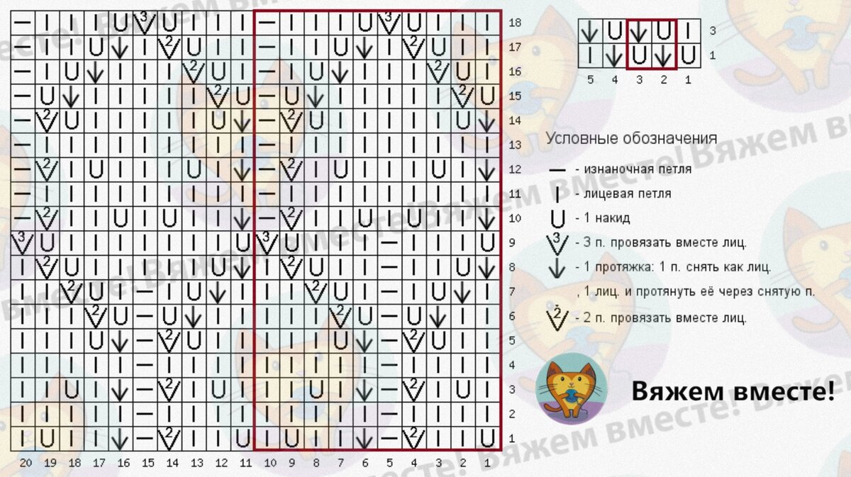 Слева — схема для вязания ромбов. Раппорт узора составляет 10 петель и 18 рядов, с 14 ряда раппорта накиды и убавления в рисунке выполняются в каждом ряду узора.