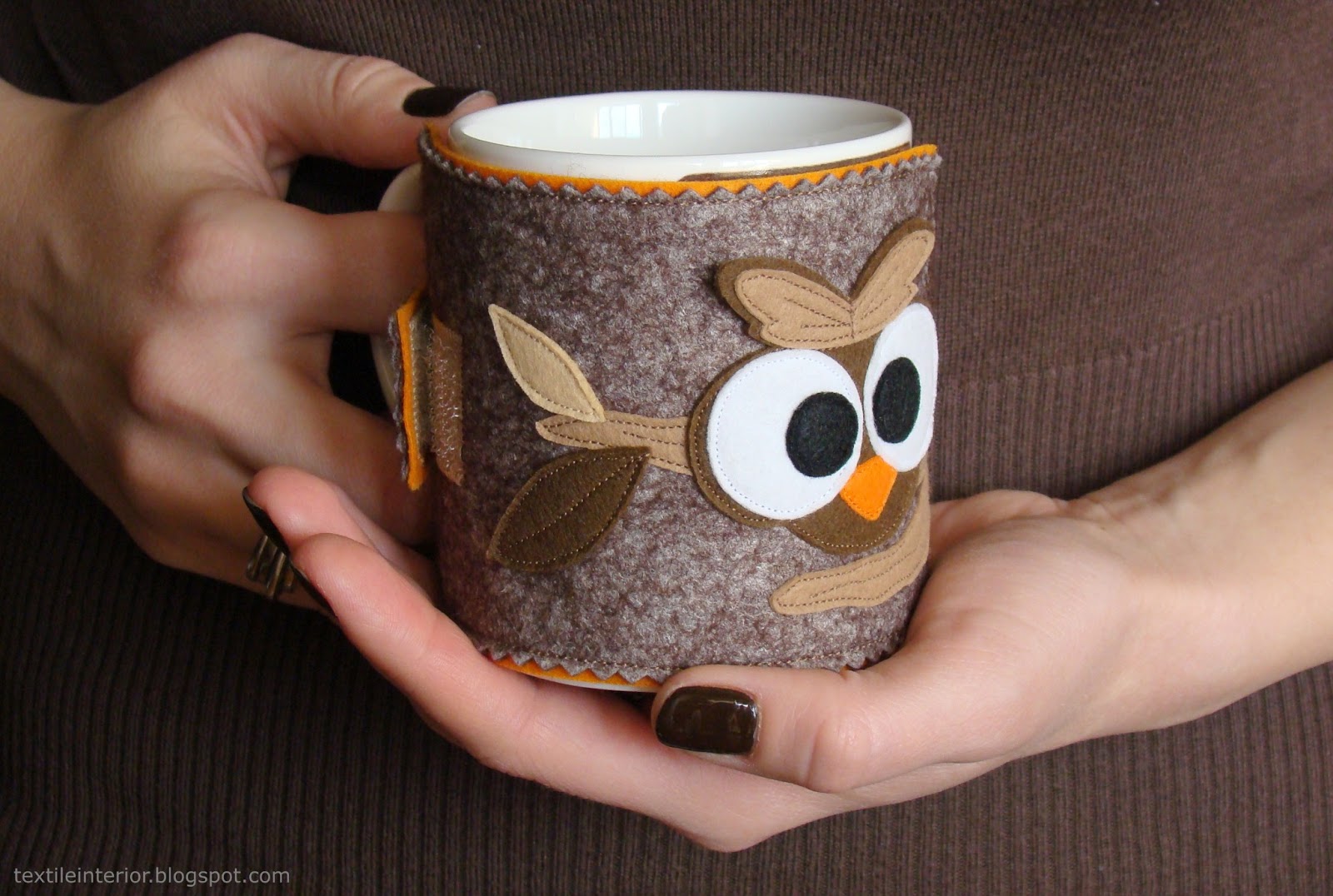 Кто сказал, что у кружки не бывает одежки? Еще как бывает! Тем более,если одежка - это стильный фетровый тулупчик с аппликацией. И сова. С большими красивыми глазищами сова;) [640x426]