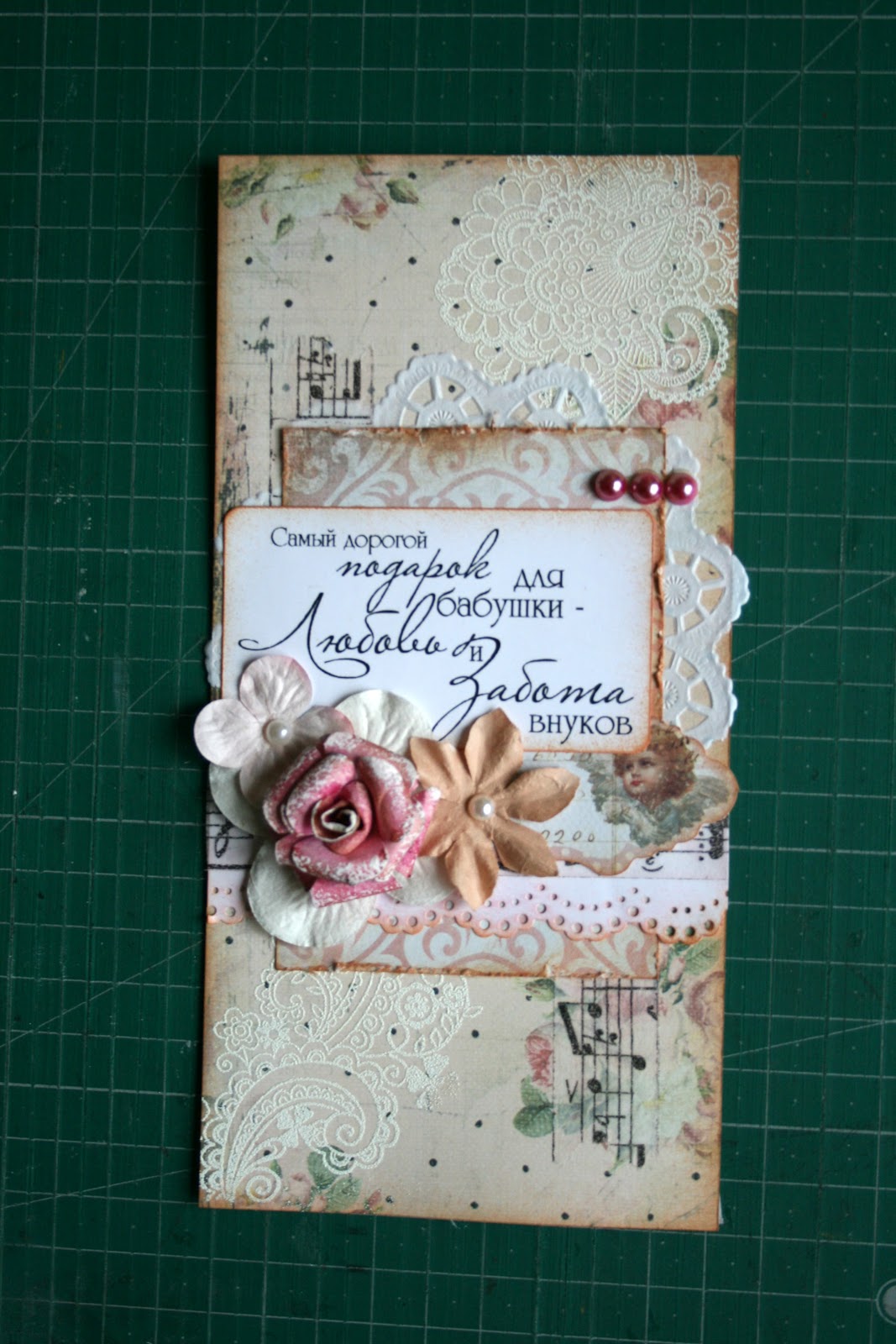 И вот результат наших трудов!)Нежная открытка с тёмлыми словами,в которой позже поселится шоколадка)