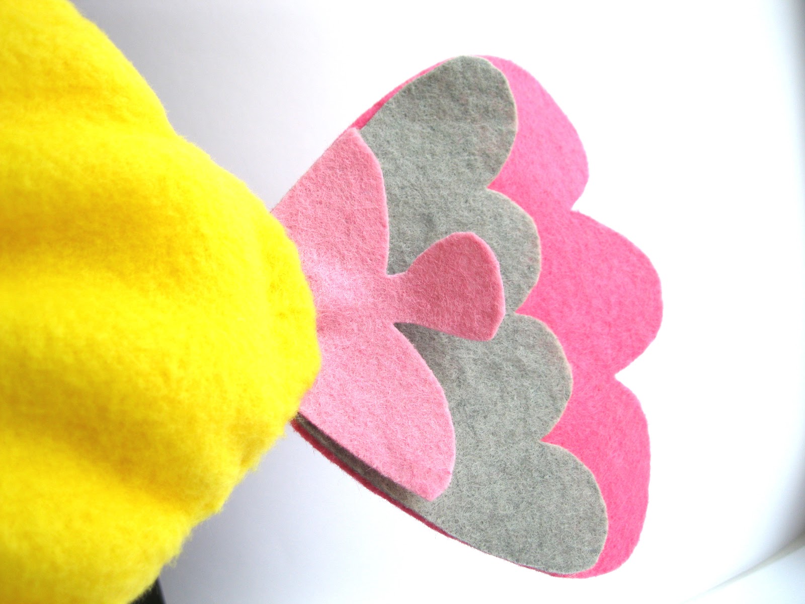 После этого вырезаем из разноцветного фетра по выкройкам крылышки, соединяем сегменты и пришиваем по бокам обметочным швом.