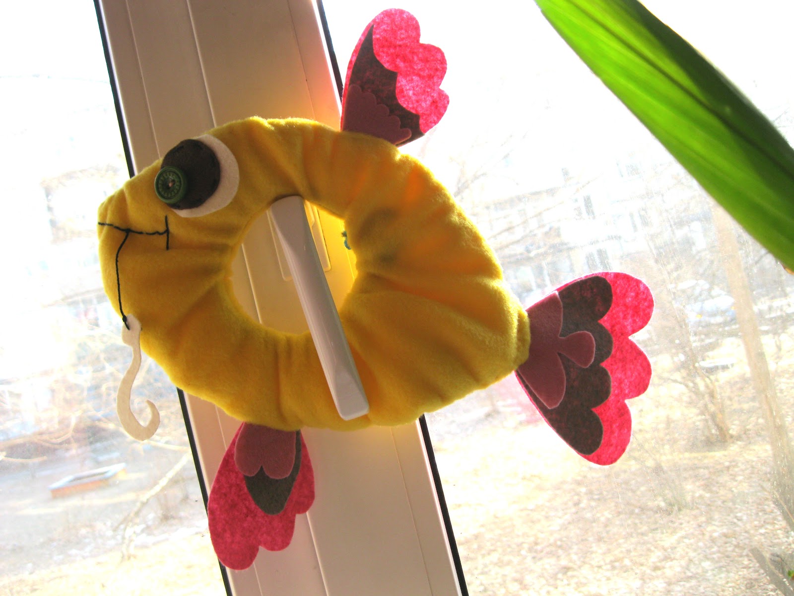 Глаза состоят из двух кругов фетра и пуговиц, их пришиваем к лицевой стороне туловища. Советую не прокалывать туловище насквозь, а прятать нитку внутри, так игрушка будет выглядеть аккуратней. Клюв пришиваем желтыми нитками.