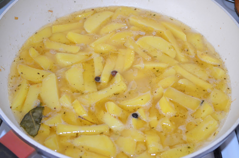 4. Пока тесто расстаивается подрумянить в сковородке или казанке лук, добавить к нему картофель и тоже слегка обжарить. Заправить специями, посолить. Залить водой до верха картошку и довести до кипения.