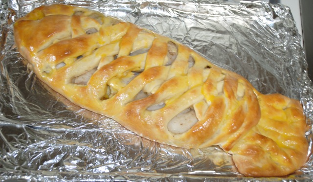 Оплетаем начинку полосками теста по типу "косички". "Рыбий хвост" оставляем незагнутым.