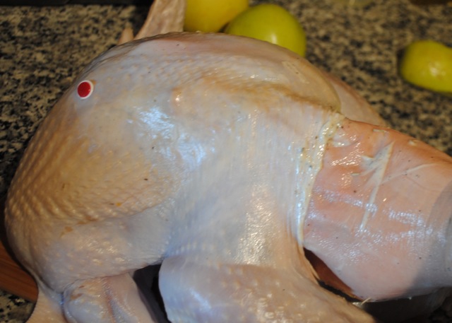 Дальше начинается интересная примочка :) Мы будем засовывать масло с травами под кожу на грудке индейки. На стыке ножки и грудки есть такой "карман," где шкурка индейки прикреплена к грудке неплотно. Аккуратно работая пальцами изнутри, отделяем шкурку от мяса грудки, не нарушая целостность шкурки.