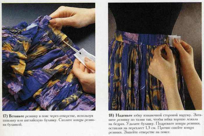 Жатая ткань уменьшается по длине и ширине. Выкраивая юбку, прибавьте 7,5 см к желаемой длине, с учетом усадки ткани. Не забудьте сделать необходимые припуски дна шов и подгибку ткани. На пошив юбки необходимо три или четыре длины. Если ткань прозрачная лучше взять четыре длины.. Что бы избежать утолщения по линии талии, нужно сделать эластичный притачной пояс.