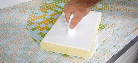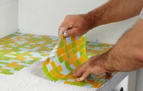 Для обыкновенной мозаики достаточно использовать обыкновенный эластичный клей, для стеклянной мозаики (как в нашем случае) требуется специальной белый клей, который не искажает цвета. Клей также служит в качестве герметика, что значительно облегчает обработку.