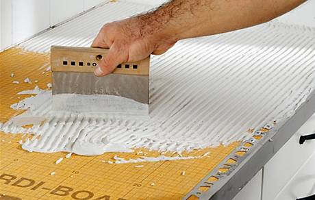 Нет смысла пытаться клеить плитку на старую столешницу. Чтобы высота кухонного гарнитура осталась прежней, придется снять старую столешницу и заменить ее новой. Как несущий слой может быть использована Kerd-Board - доска из экструдированного жесткого пенополиуретана, которая с двух сторон оснащена специальным укрепляющим материалом для облегчения наклеевания плитки. Поставляется толщиной от 5, 9, 12,5, 19, 28, 38 и 50 мм. Она оснащена сантиметровой сеткой для облегчение измерения и резки. На ней вы можете класть плитку без предварительной подготовки. Для закрытия края производитель в комплекте с доской дает профиль из нержавеющей стали, который просто насадится на доску и приклеется вместе с мозаикой.