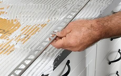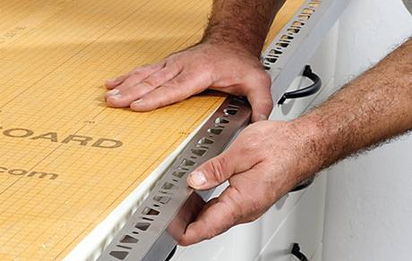 Профиль из нержавеющей стали, который дается в комплекте с Kerdi-Board, насадим на край доски (перфорированным плечом наверх).