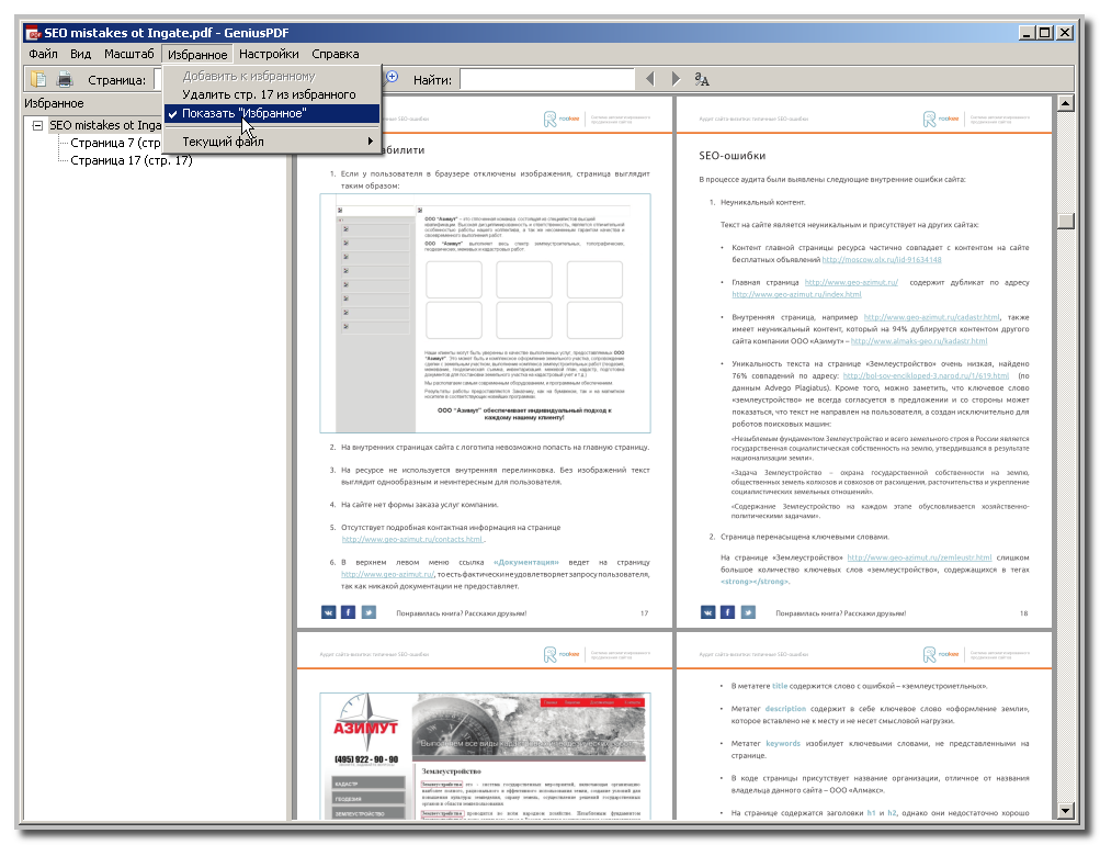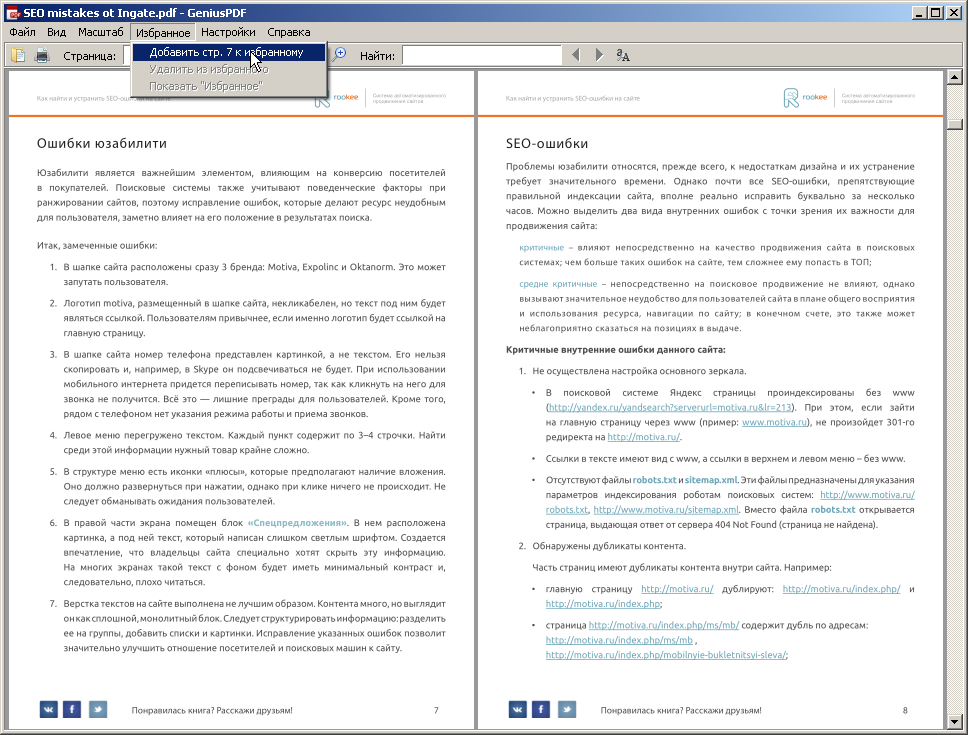 В программе очень удобно работать с избранным, поэтому остановлюсь на этом подробнее. Избранное - это фактически наши закладки в документе. И, кстати, что довольно интересно, закладки сохранятся для каждого из документов, с которыми мы работаем. Чтобы добавить закладку в избранное, заходим в меню "Избранное" и кликаем по строке "Добавить страницу...к избранному":