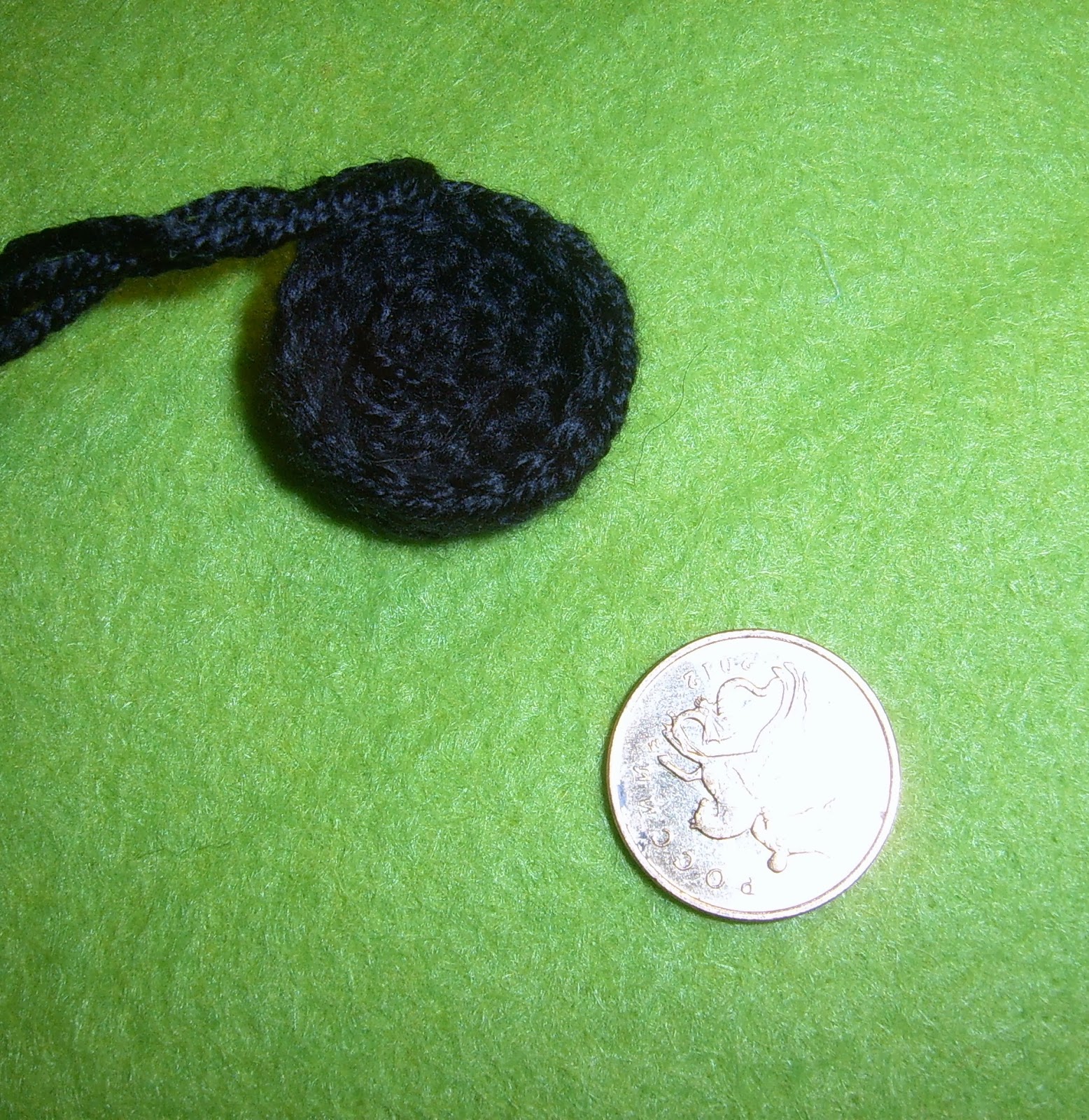7 вп, начиная со второй петли от крючка вязать по 2 сбн в каждую петлю. деталь должна закрутиться в спираль. Нить закрепить, оставить конец для пришивания и обрезать.