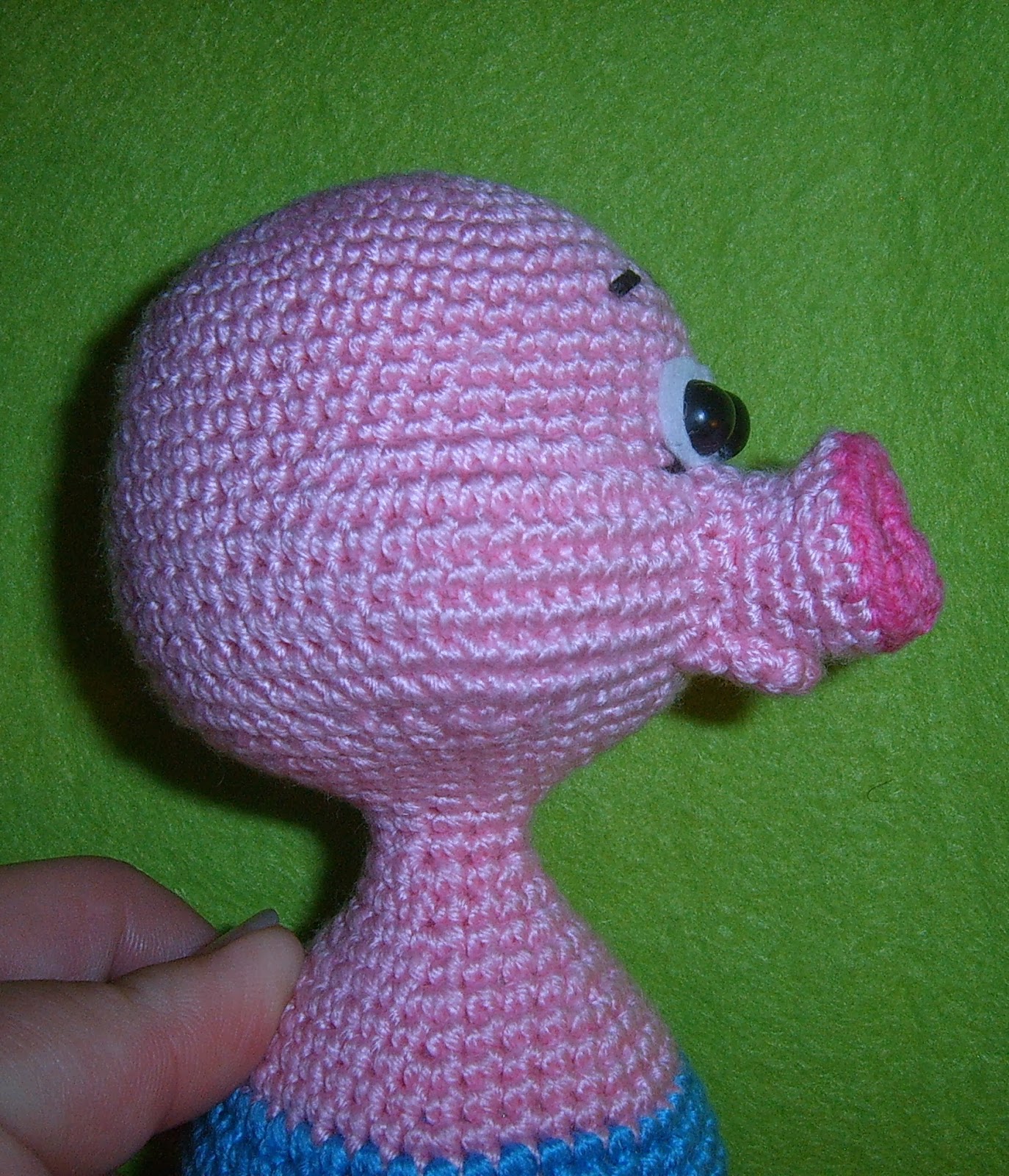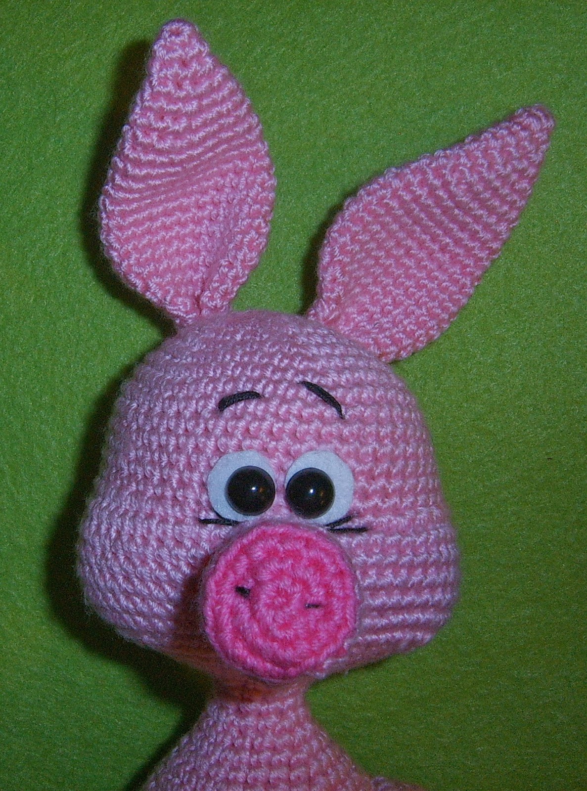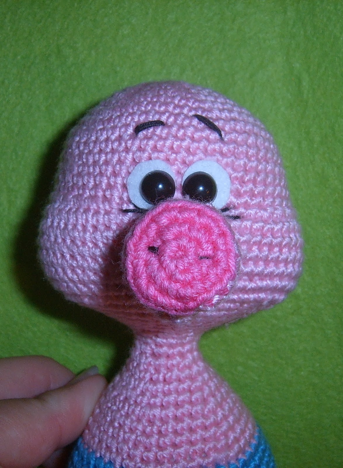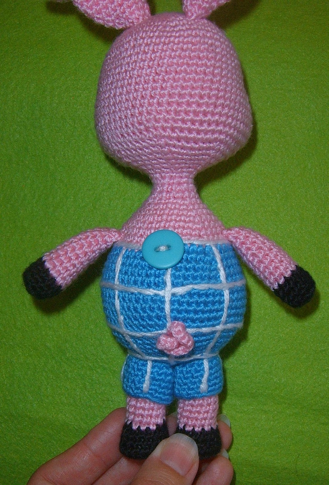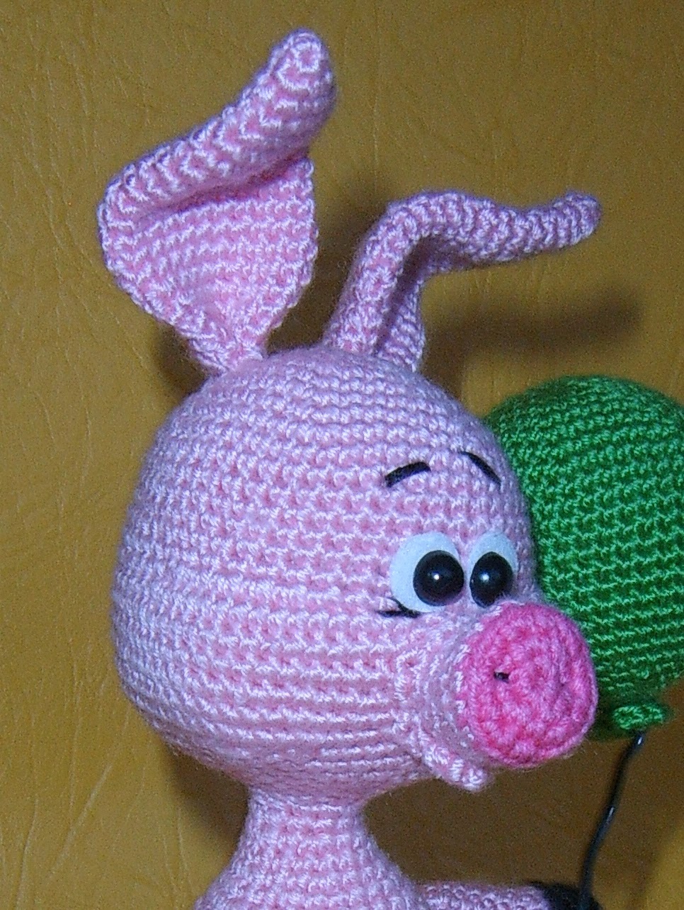 Пряжа должна быть одной толщины. Я ипользовала пряжу магик микрофибра 152 м на 50 грhttp://www.kudel.ru/...rofibre-big.jpg розовая, голубая и зелёная. примерно по 30гр чуть-чуть ярко-розовой для пятачка, немного чёрной для копыт