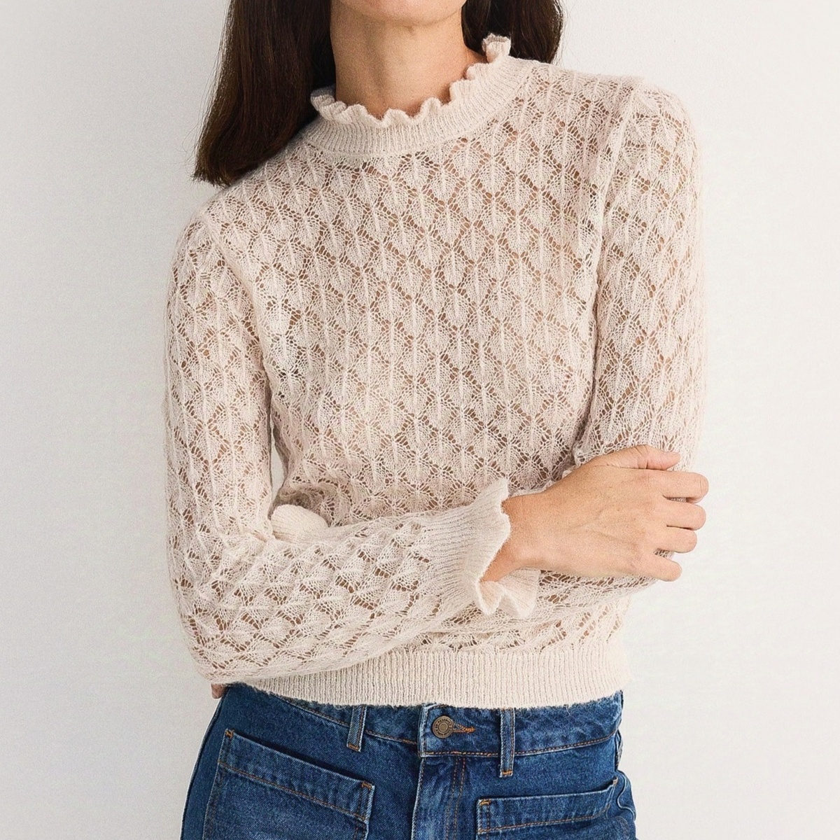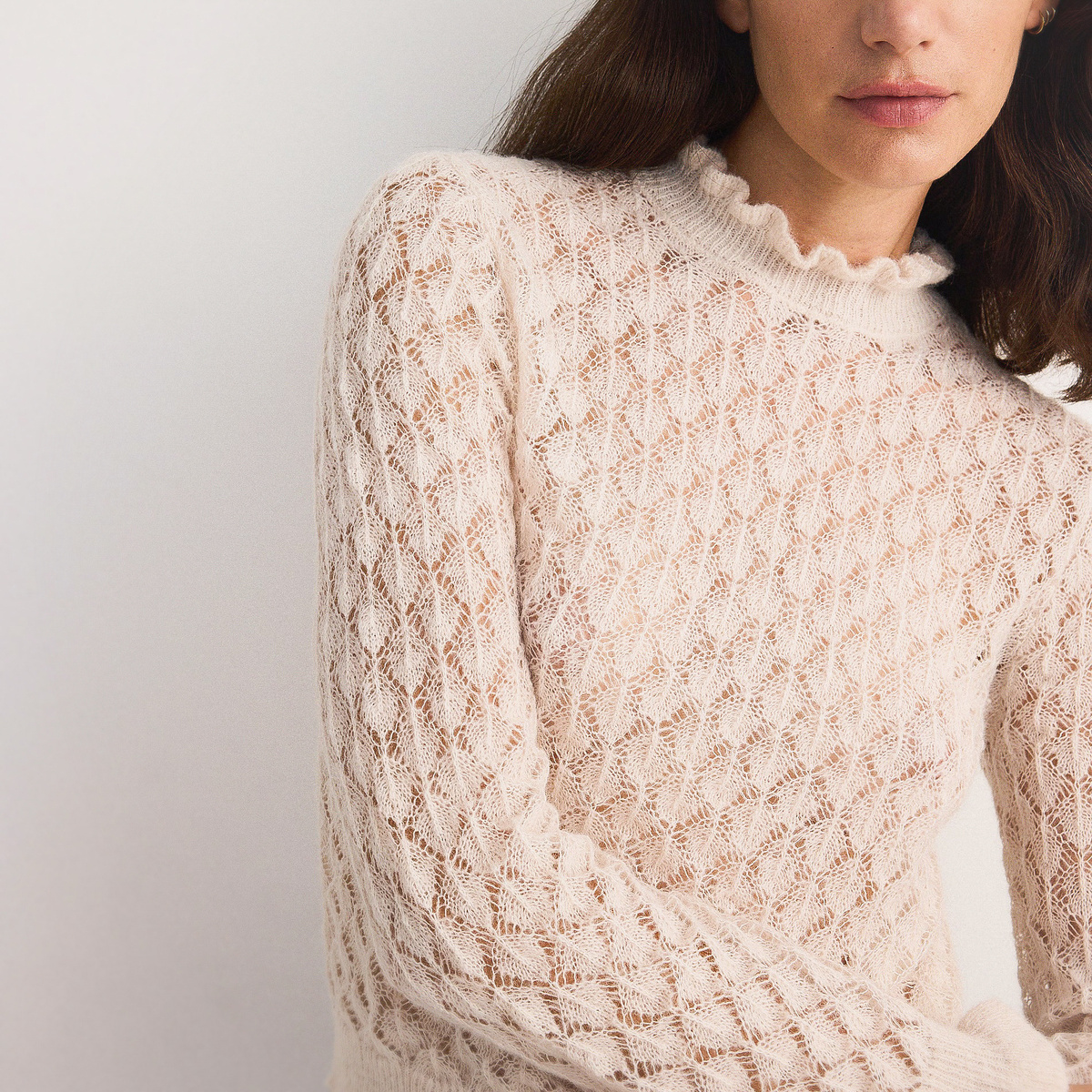 Женственный джемпер с полупрозрачным ажуром по всей своей площади. Интересные детали — оборки на рукавах и на горловине. Состав оригинала: 63% полиэстер, 27% полиамид и 10% шерсти.