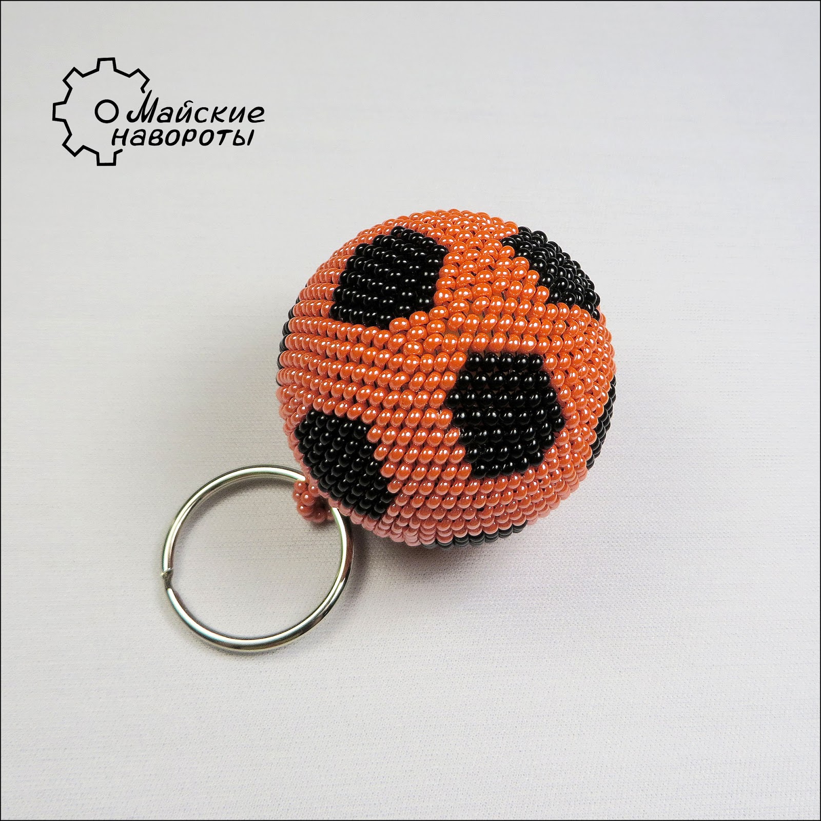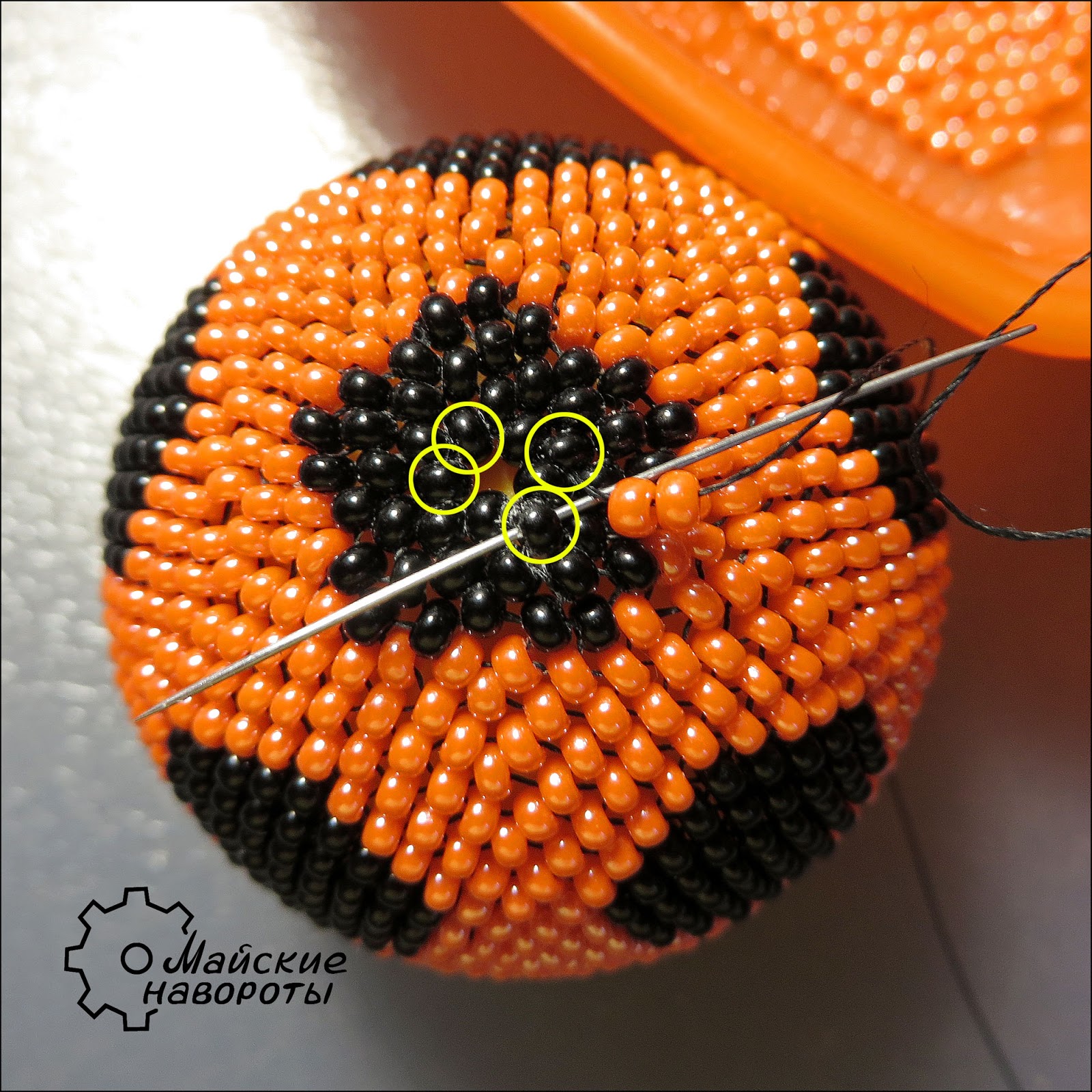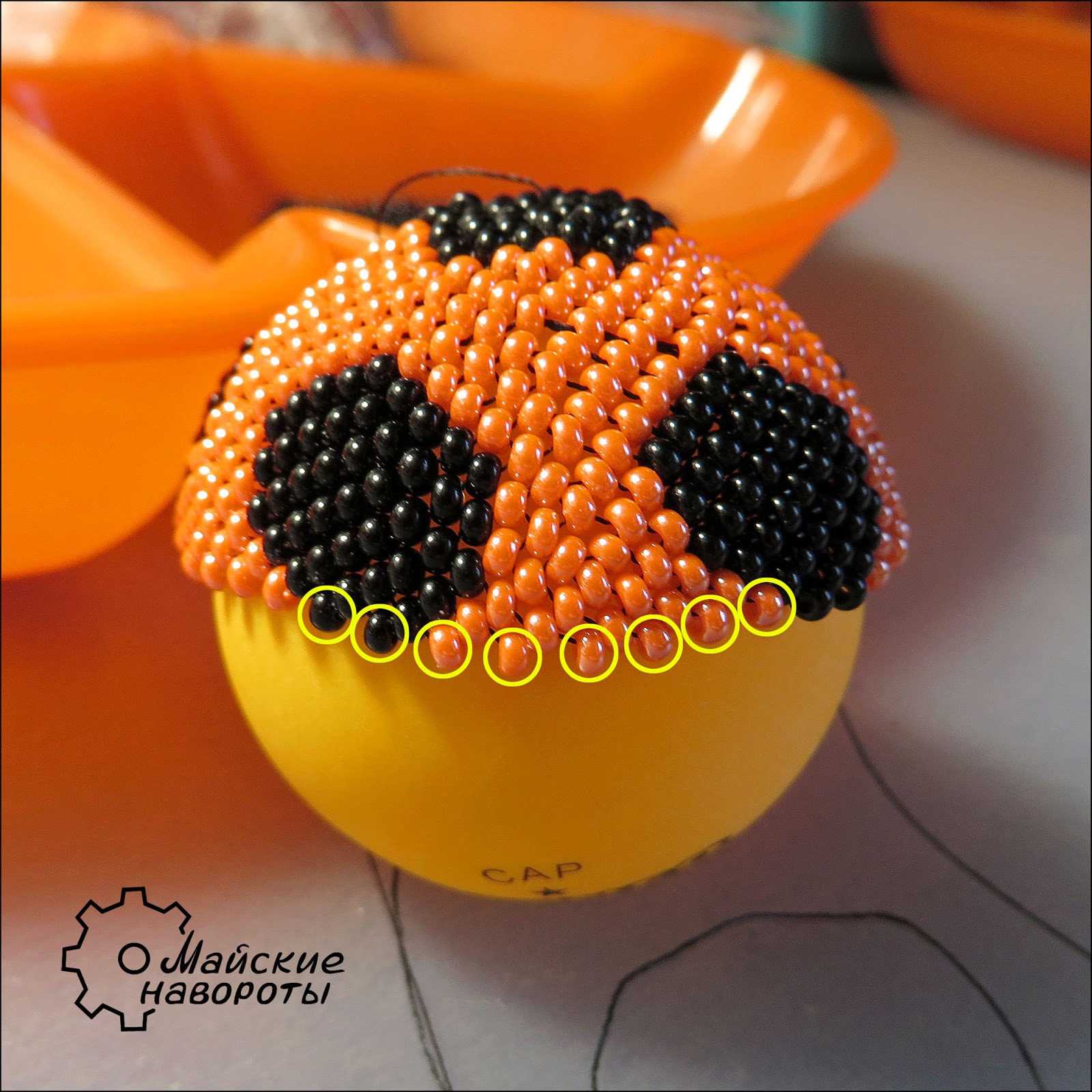 - чешский бисер №10 двух цветов. У меня - черный и оранжевый, поскольку оранжевый привлекает внимание под рукой оказалась не белая основа. - шарик для пинг понга диаметром 40 мм. В идеале - белый. - капроновая нить в тон одному из цветов №35 или 50. Капрон хорошо держит натяжение при стягивании полотна. - игла для бисероплетения №12 или тоньше. - кольцо для брелоков. - воск для вощения нити, ножницы, зажигалка для опаливания зафиксированных концов нити и мелкий крючок для убирания концов в воду на изнанку - по обоюдному желанию:) 1. Плести будем две половинки, которые затем будем сшивать между собой. Начинаем первый акт марлезонского балета с 5 бисерин черного цвета. Я калибрую бисер по толщине в процессе плетения.