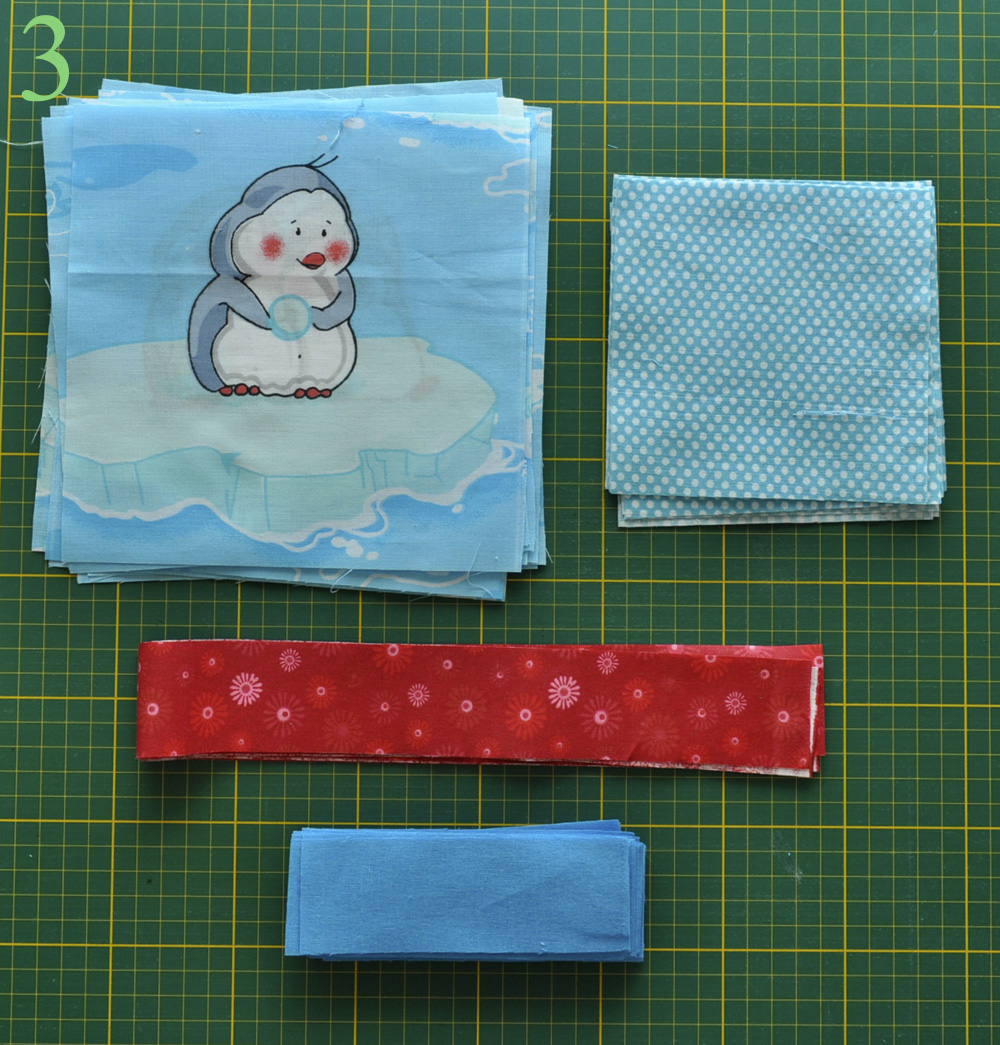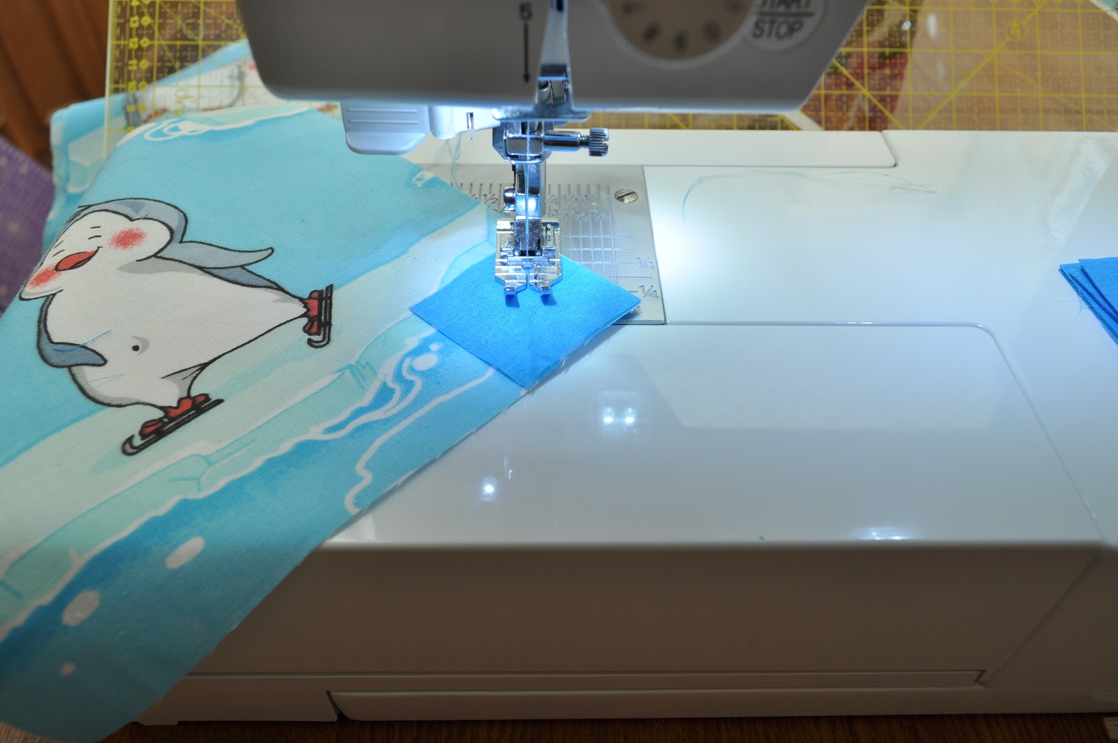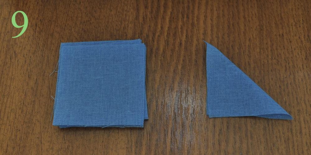 1. К каждому уголку квадратов с рисунком пришиваем по маленькому квадратику, прокладывая строчку именно по сгибу. Ненужные припуски –уголки срезаем