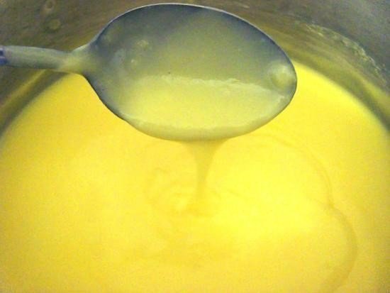 Смешиваем обе массы и ставим вариться — сначала крем будет жидким, но постепенно загустеет.