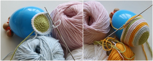 Вначале обвязываем яйцо от киндер-сюрприза, предварительно наполнив его бусинами/ крупой/ сухим горохом для гремучести.