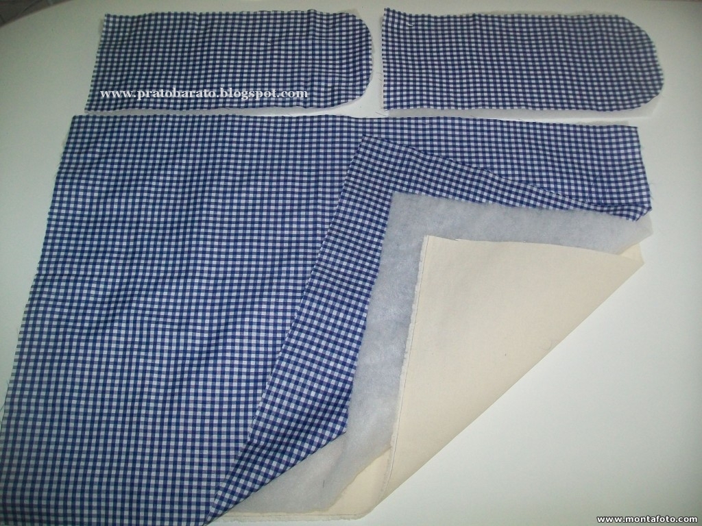 6. Выкроить из простёганного прямоугольника две боковые детали чехла с припуском ок. 1 см по боковым и верхней стороне и ок 3-4 см – по нижней. Прежде, чем вырезать, убедитесь, что детали симметричны! Сложить пополам основную деталь и отметить места сгибов. Затем сложить по вертикали боковые детали и отметить середину верха.