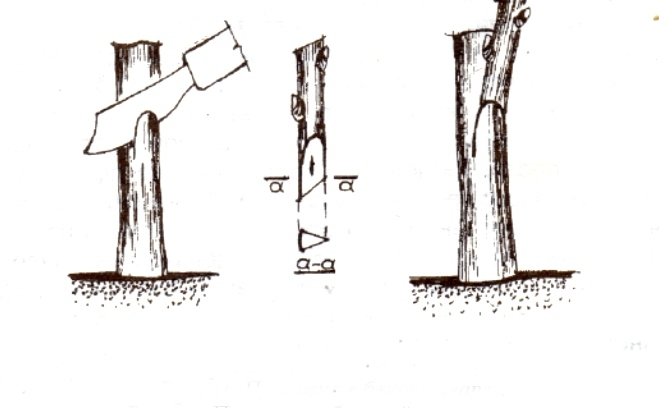 Для прививки черенком используют прививочный нож. Он имеет удлинённый клинок с прямым лезвием, которое затачивается только со стороны, где снята фаска. При такой заточке легко делать ровные гладкие разрезы любой длины. Черенки лимона для прививки должны иметь не менее 2-3 почек и зелёную эластичную кору. Прививки черенком делают в расщеп и в боковой зарез. Успех при этих способах прививки зависит от правильно сделанного косого среза на конце черенка. Длина его должна в 3-3,5 раза превышать диаметр черенка. Черенок берут не менее 10 см длиной, он должен иметь 3-4 почки. Все листья с черенка обрезают, оставляют только черешки. Прививку в расщеп применяют, если ветку, на которую прививают черенок лимона, можно расщепить посередине. Чаще всего на высоте 10 см от грунта срезают всю крону, по центру ствола делают расщеп, в который вставляют черенок. При этом способе прививки нижний край черенка срезают клином длиной 3-4 см.