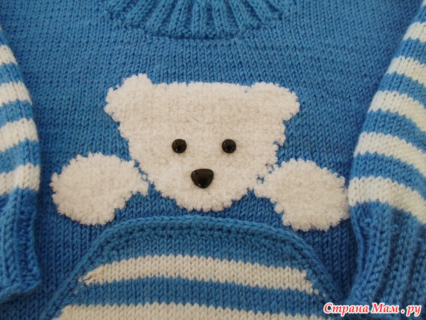Мишку вывязала из пряжи Ализе Софти, методом интарсии(каждый участок от своего клубочка). Вязала так первый раз, хотя простых жаккардов связано было немало. На изнанке нет протяжек. Решила, что будет у меня мишка, как будто сидящий в кармашке-кенгуру