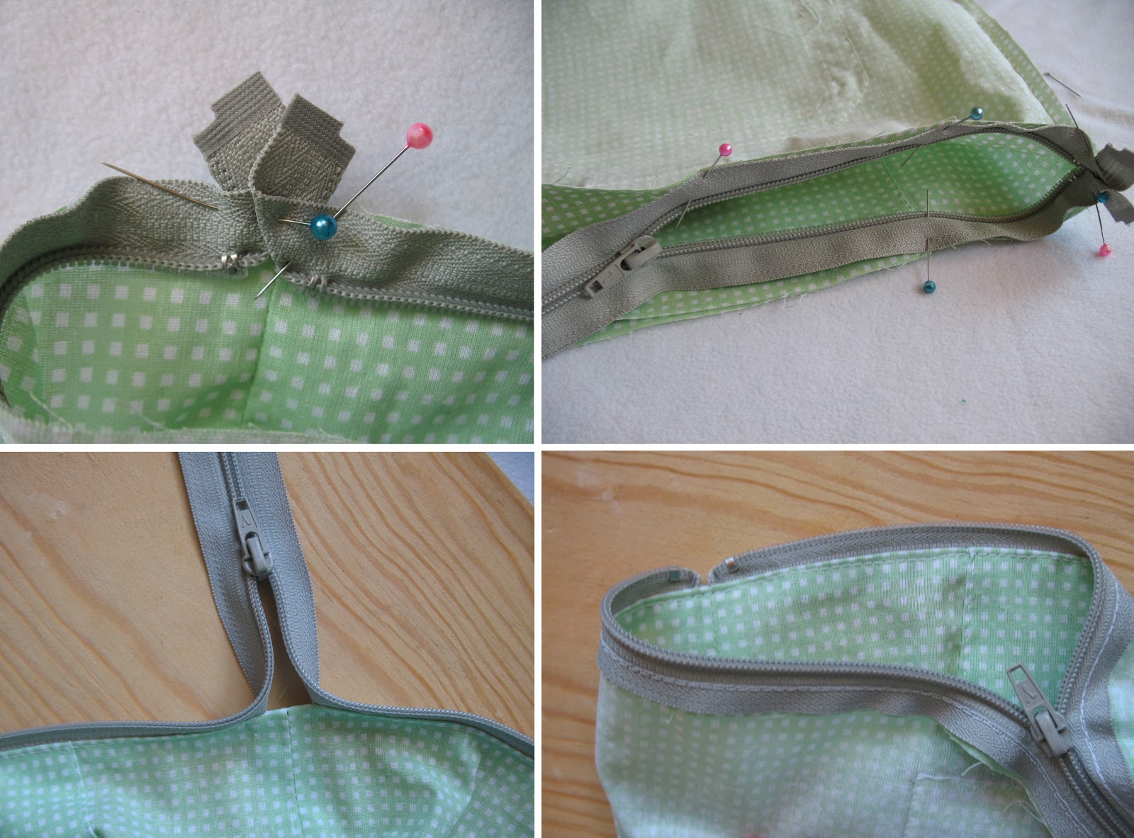 11-12. Вкладываем этот мешок внутрь сумки. Честно, я не знаю, с какой стороны должна быть собачка у закрытой молнии, можно посмотреть у готовой покупной сумки.