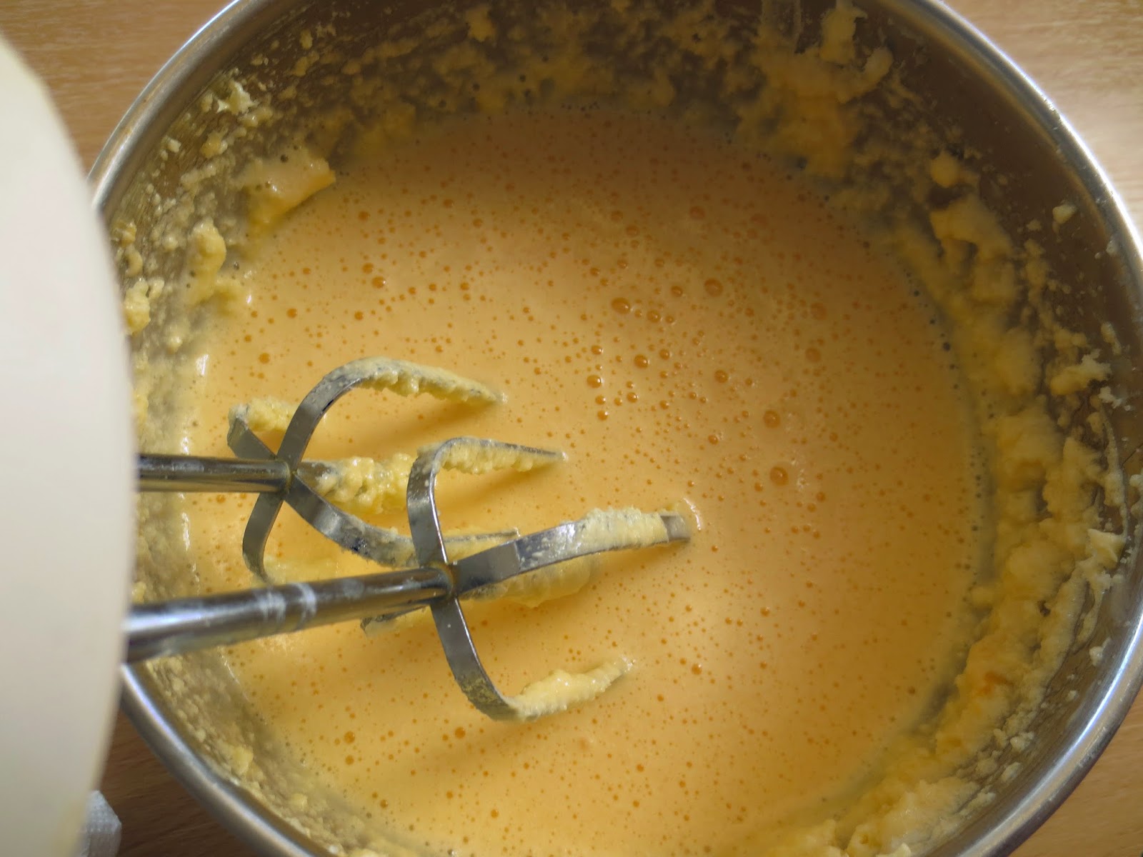 2.Добавляем сахар и продолжаем взбивать. Затем добавляем по одному яйцу и продолжаем взбивать, пока смесь не станет однородной