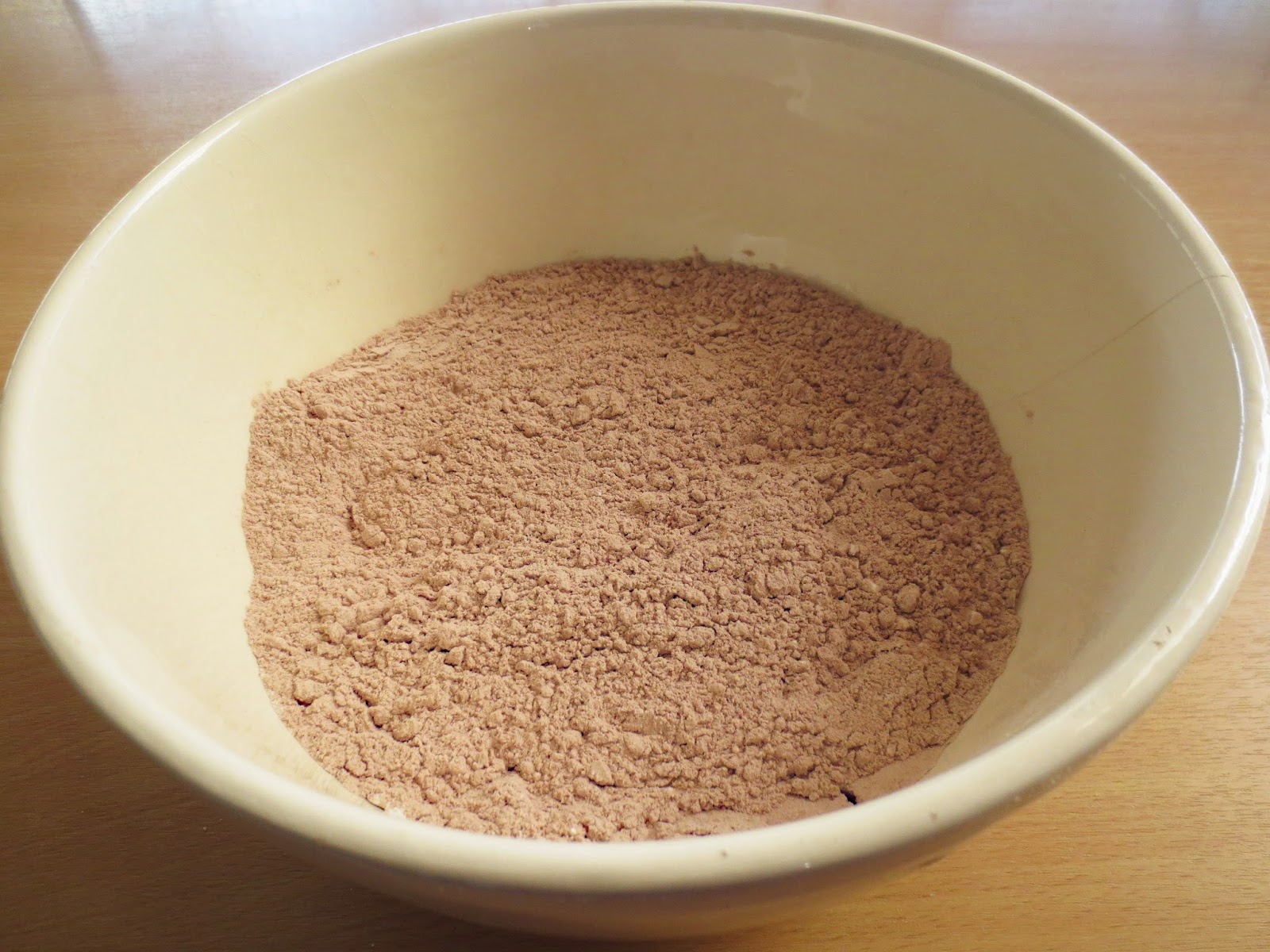3.В отдельной чашке смешиваем просеянную муку, какао, разрыхлитель и соду, хорошо перемешиваем.