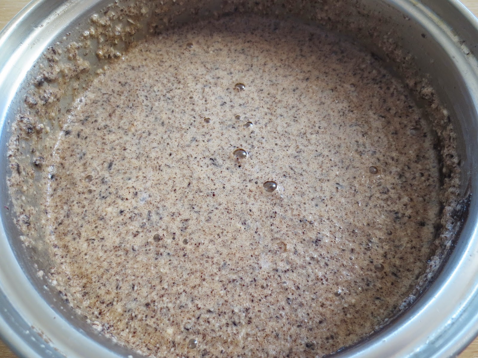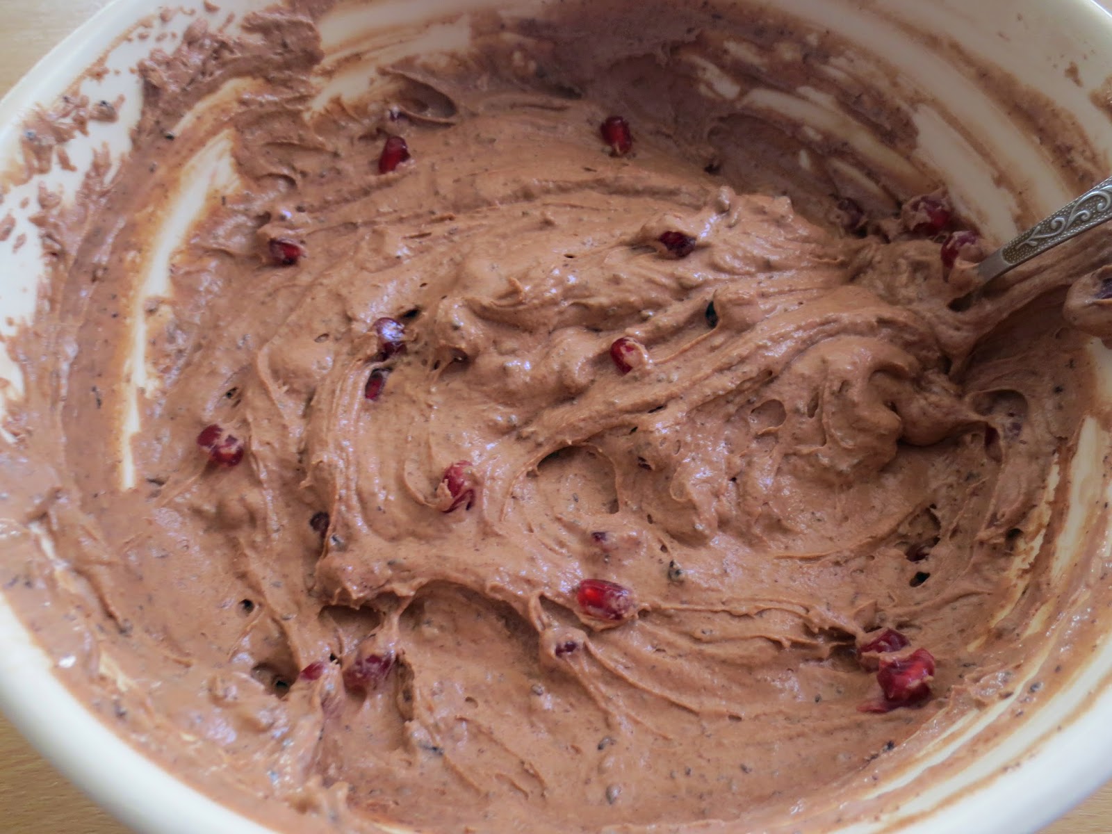 Этот простой в приготовлении пирог, имеет необычный вкус, не только потому что в нем сочетается вкус шоколада и граната, но и потому, что низ и верх пирога более плотный, а в середине текстура напоминает халву.