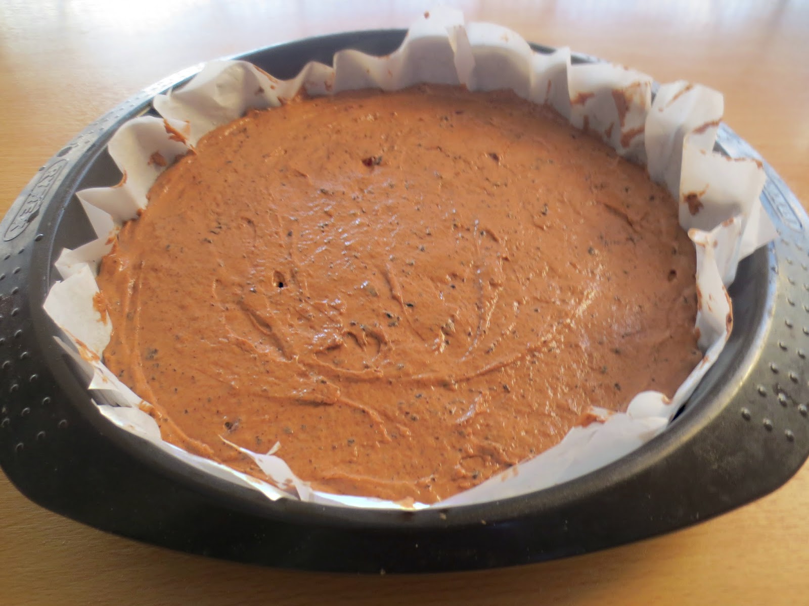 7.Круглую форму ( 28 см) застилаем бумагой для выпечки , смазываем ее маслом и выкладываем тесто.