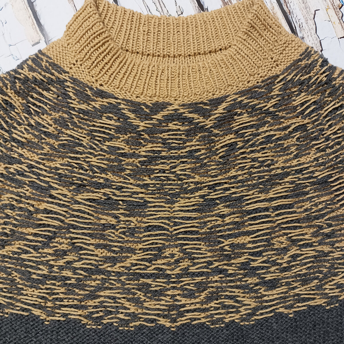 Корпус 208п и рукава 64п вяжу прямо пряжей серого цвета на спицах 4,0, внизу вывязала фрагмент жаккарда из 5 рядов (не забыть перейти на спицы 4,5). Закончила резинкой 2х2 на спицах 3,0 с убавлением 10 петель, чтобы не получилось юбки 🙈, так как пряжа не держит резинку. Закрытие через протяжку по изнаночными петлям