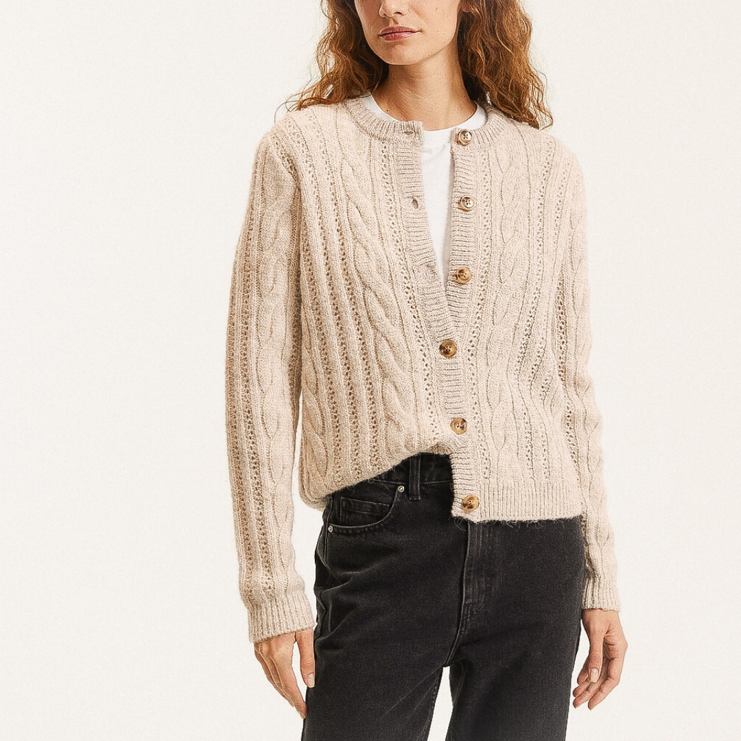 Кардиган привлекает внимание своими аккуратными жгутами и ажурными вертикалями.