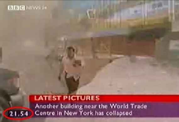 11 сентября 2001 года в 21:54 (GMT) репортер британского телеканала BBC сообщил в прямом эфире, что рухнуло здание номер 7 (в которое не попадал самолет). Сообщение также было продублировано текстом. На самом же деле здание WTC 7 «сложилось» только через 26 минут после заявления репортера.